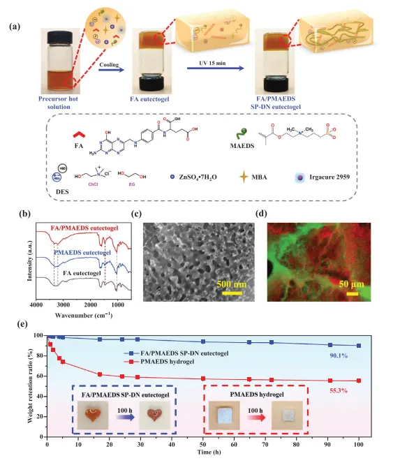 材料与制备工艺:凝胶采用“超分子网络+聚合物网络”双网络结构,FA通过分子间氢键、π-π堆积及锌离子配位形成超分子网络,PMAEDS通过紫外光聚合形成两性离子聚合物网络;分散介质为氯化胆碱(ChCl)-乙二醇(EG)深共熔溶剂,避免传统水凝胶的失水问题(论文1 2.1节);