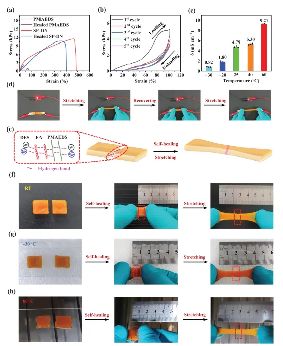 宽温域与环境稳定性:在-30℃至60℃范围内保持柔性与性能稳定,-30℃时电导率仍达0.82 mS·cm⁻¹,60℃时达9.21 mS·cm⁻¹;空气中存放100小时重量保留率90.1%,远优于传统水凝胶(55.3%)(论文1 Fig. 1e、2c;2.2节);