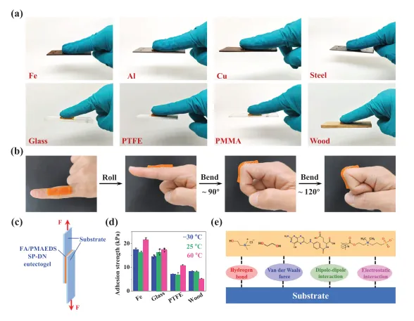 核心机制:FA超分子网络赋予凝胶快速自修复与强粘附性能,PMAEDS聚合物网络提供机械支撑与离子传导通道;DES体系中的氢键与各组分间的静电作用、配位作用协同,实现网络的刚性-柔性互补(论文1 Fig. 1a、2e;2.1-2.2节);