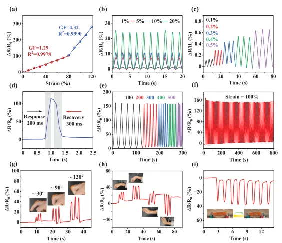 核心基础性能:拉伸应变达465%,应力11.5 kPa;离子电导率4.79 mS·cm⁻¹,远高于单一PMAEDS凝胶(1.31 mS·cm⁻¹); gauge factor(GF)达4.32(80%-120%应变区间),响应时间仅200 ms(论文1 Fig. 2a、4a、d;2.2-2.3节);