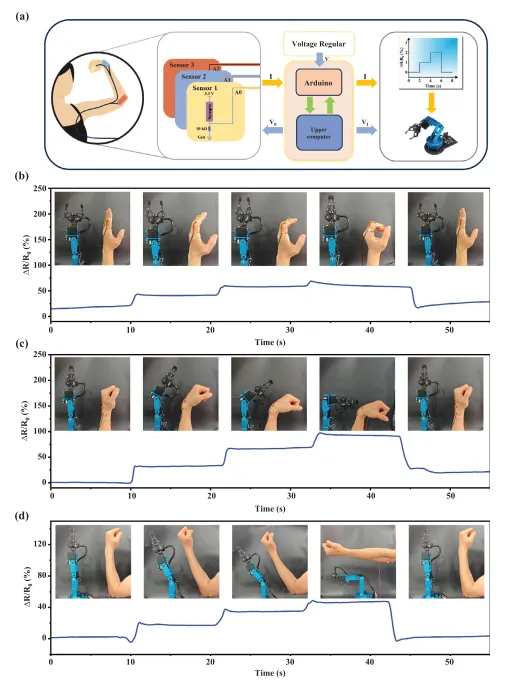 人机交互:将传感器集成于手指、手腕、肘部,通过运动产生的应变信号驱动机械臂完成对应动作(手指开合、手腕旋转、肘部弯曲),实现精准远程操控(论文1 Fig. 5;2.3节);