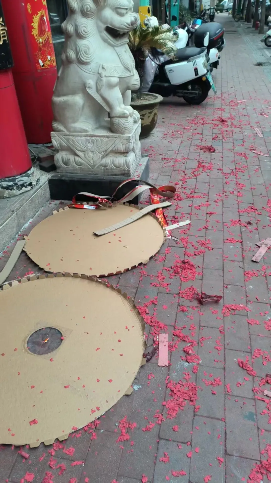 2月25日中午12时许,记者来到位于郑州市农业路与经一路交叉口向北约100米路东的葛记焖饼店门前。此时,该店门前的人行道上,红色的爆竹碎屑铺满了地面,就连停放在人行道两边的电动车下也散落着许多残屑,其店门口处地面上还遗留着两片圆形的爆竹包装。