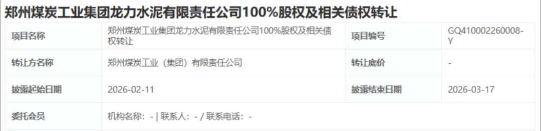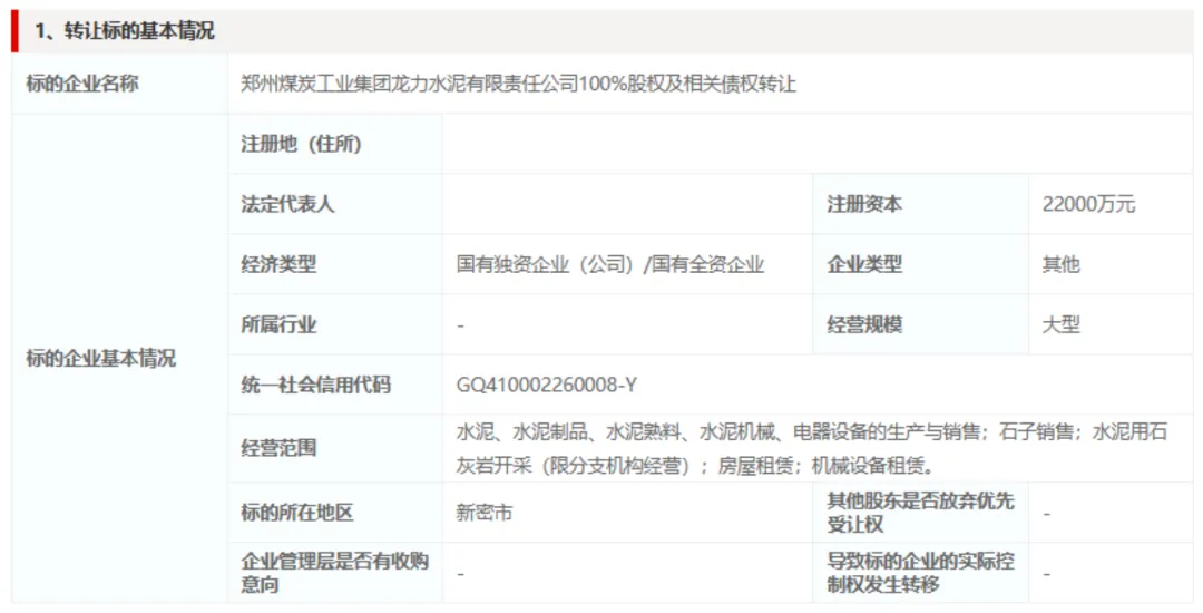某产权交易平台近日披露,郑州煤炭工业集团龙力水泥有限责任公司100%股权及相关债权正进行挂牌转让,但转让底价尚未公布。