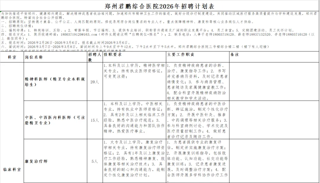 为加快推进平安郑州、健康郑州建设,解决精神类患者收治难的问题,加速推进郑州市精神卫生工作建设,落实分级诊疗制度,共同推动区域精神卫生医疗服务质量提升与学科建设发展。郑州君鹏综合医院作为郑州市精神卫生及郑州市第八人民医院医业务承载单位,将面向全社会公开招聘精神卫生方面专业技术人员。郑州君鹏综合医院作为郑州市第八人民医院业务承载单位,将发挥重要的技术服务补充作用。医疗团队组成,由郑州市第八人民医院专家任执行院长,各科室主任均有八院国家、省、市级专家团队常年派驻。医院占地面积近100亩,环境优越、交通便利,拥有国内一流医疗设备。医院一期投入使用45000平方米,开放床位1000张;二期计划使用60000平方米,预计2026年底前投入使用,开放床位3000-4000张。此外,医院还拥有各类型救护车辆50余台,为后续精神患者的医疗转运服务工作奠定了坚实的基础。为实现医院“康复一人,幸福一家,共建和谐”的办院理念,落实与郑州市第八人民医院深度融合的工作要求,努力打造成河南精卫治疗、康复为一体的“小综合、大专科”颇具人性化、现代化的一流专科医院,充分保障每一位患者得到便捷、高效、安全的诊疗服务,现医院急需招聘相关方面卫生技术人才(招聘详情,见附表)。一、招聘原则: