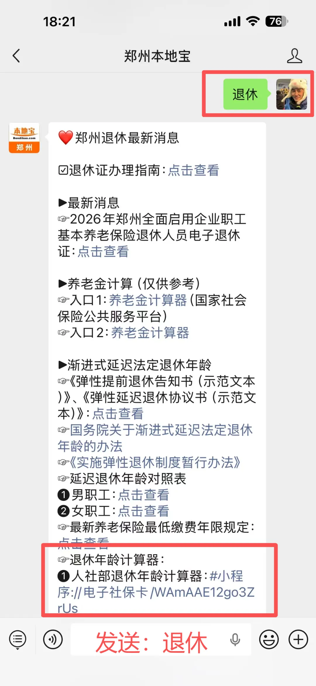 ✅法定退休年龄查询入口:扫描下方二维码,进入【郑州本地宝】,在后台聊天对话框回复【退休】,获取法定年龄计算器入口、养老金计算器