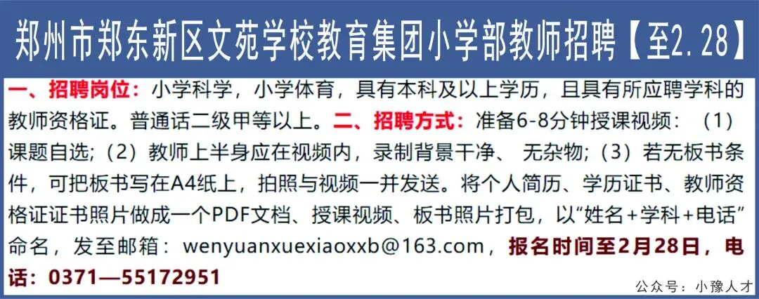 >郑州市郑东新区文苑学校教育集团小学部教师招聘【至2.28】
