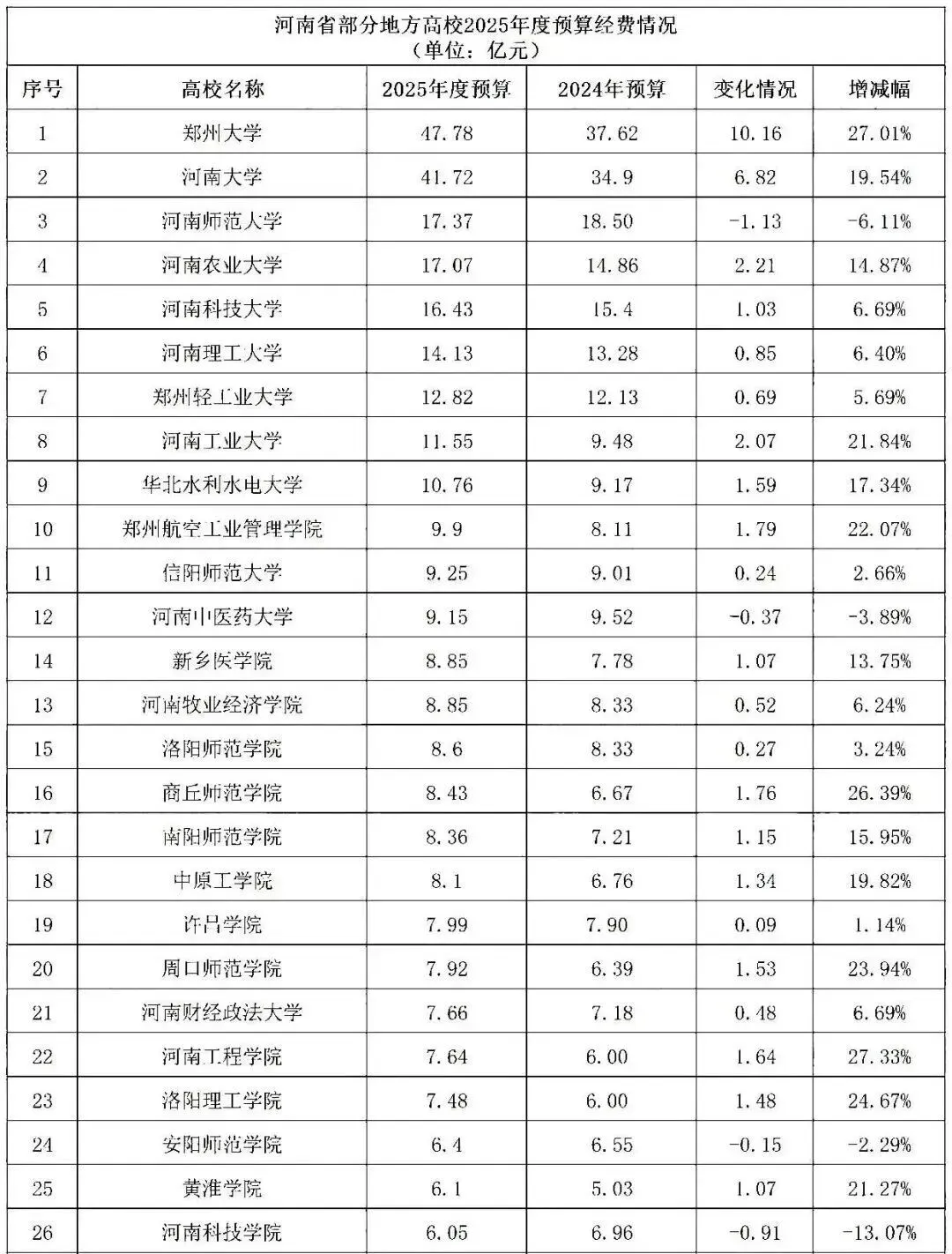 而就在这个基础之上,还有中原工学院准备更名为河南电子科技大学,郑州航空工业管理学院准备更名为郑州航空航天大学,加上华水、轻工业大学、河南医药大学,办学经费大家很明显的可以看出来,几乎没有差距。