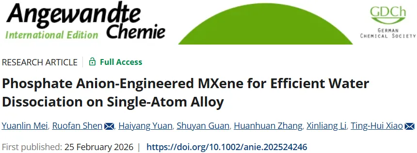 2026年02月25日,郑州大学肖廷辉、沈若凡团队在Angewandte Chemie International Edition期刊发表题为“Phosphate Anion-Engineered MXene for Efficient Water Dissociation on Single-Atom Alloy”的研究论文,团队成员梅原林、沈若凡为论文共同第一作者,肖廷辉、沈若凡为论文共同通讯作者。