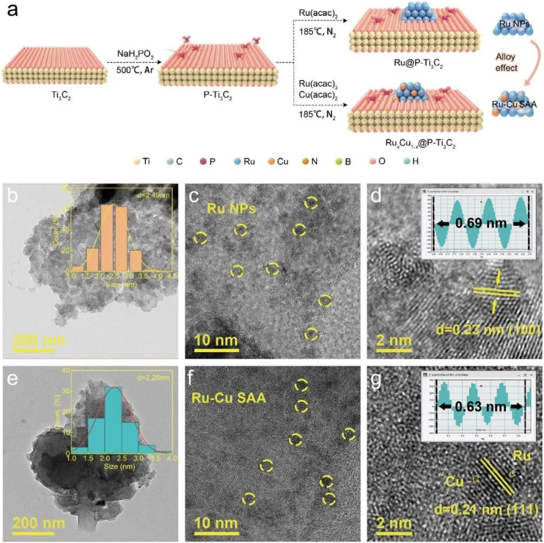 图1 催化剂的设计与合成示意图(a)。Ru@P-Ti₃C₂的TEM图像、粒径分布图和HRTEM图像(b-d)。Ru@Cu@P-Ti₃C₂的TEM图像、粒径分布图和HRTEM图像(e-g)。