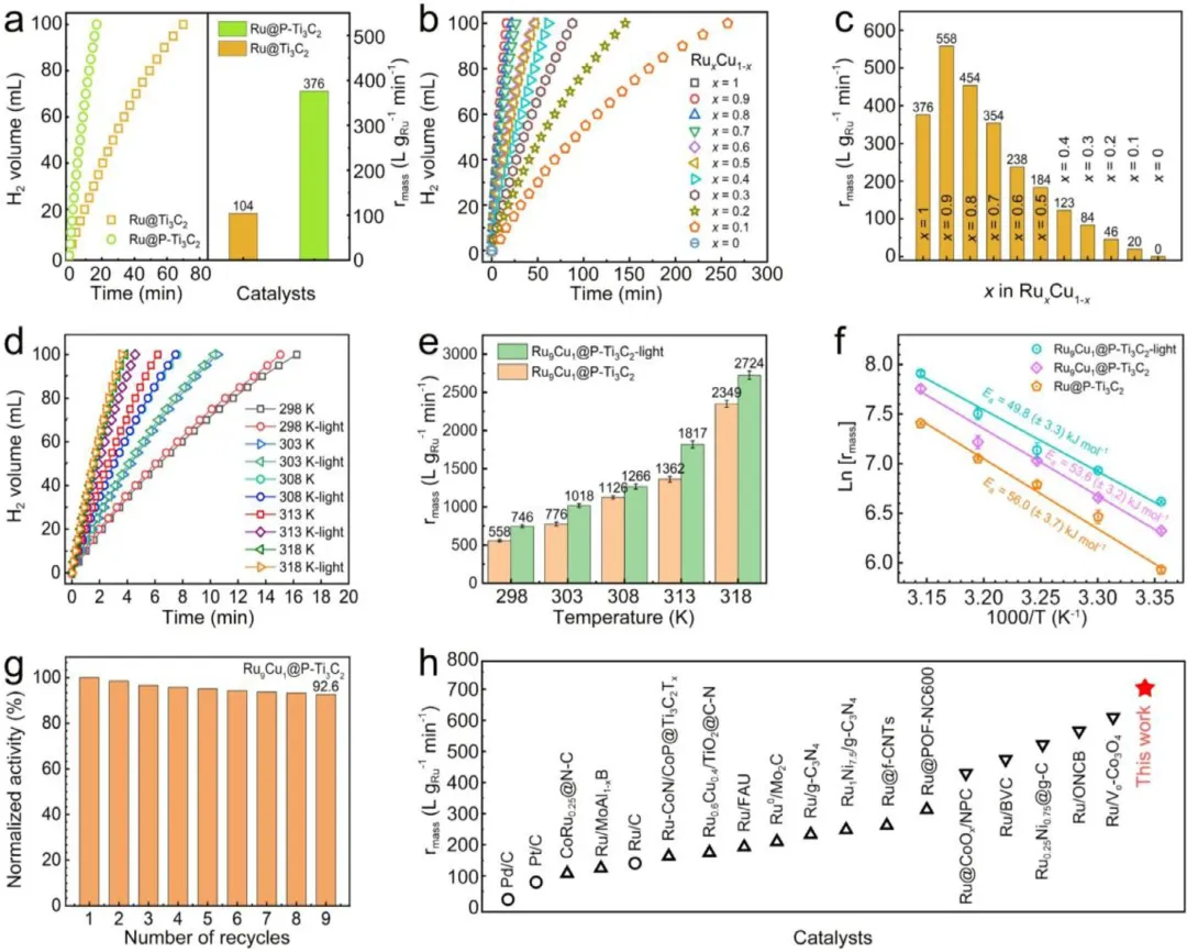 图 3 Ru@Ti₃C₂和Ru@P-Ti₃C₂用于AB水解的产氢性能比较(a)。在298K下,AB在RuₓCu₁₋ₓ @P-Ti₃C₂催化剂上水解的产氢时间曲线 (b)。RuₓCu₁₋ₓ@P-Ti₃C₂催化剂在298 K下的质量比活性(rmass)值 (c)。在不同温度和光照条件下,AB在Ru₉Cu₁@P-Ti₃C₂催化剂上水解的产氢时间曲线 (d)。Ru₉Cu₁@P-Ti₃C₂催化剂在不同温度和光照条件下的质量比活性值 (e)。Ru@P-Ti₃C₂、Ru₉Cu₁ @P-Ti₃C₂和Ru₉Cu₁ @P-Ti₃C₂-光照的随温度变化的动力学曲线及相应的表观活化能(Eₐ)(f)。Ru₉Cu₁@P-Ti₃C₂的耐久性测试 (g)。Ru₉Cu₁@P-Ti₃C₂与商业催化剂及近期报道的用于AB水解的Ru基催化剂的质量比活性比较 (h)。所有误差线代表从三次独立实验中获得的相应值的标准偏差。