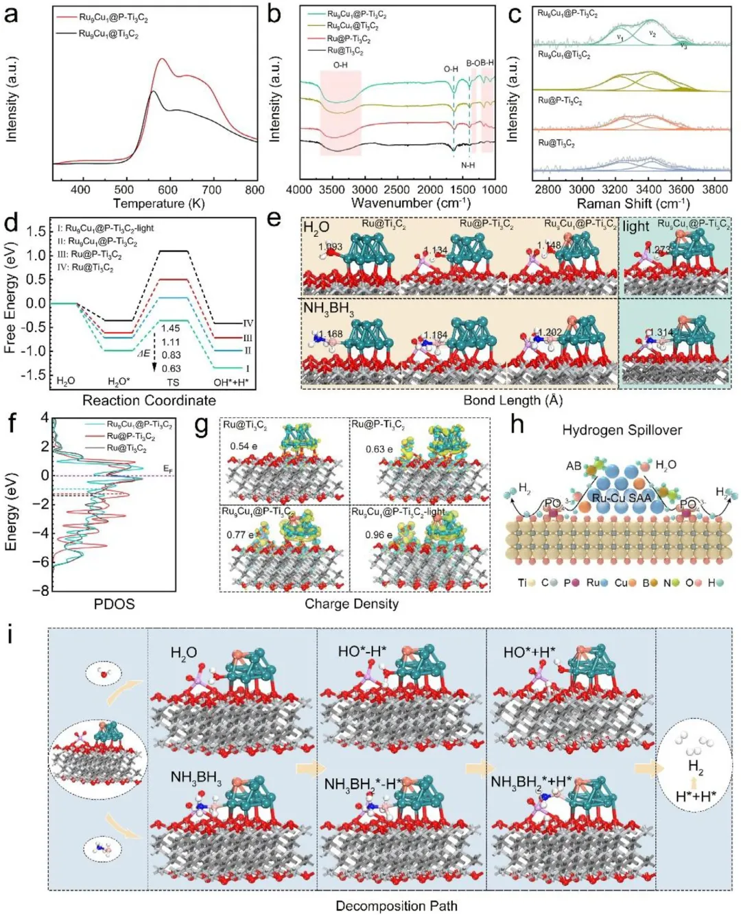 图4 | Ru₉Cu₁@Ti₃C₂和Ru₉Cu₁@P-Ti₃C₂的H₂-TPD结果(a)。Ru@Ti₃C₂、Ru@P-Ti₃C₂、Ru₉Cu₁@Ti₃C₂和Ru₉Cu₁@P-Ti₃C₂上AB水解的原位FT-IR光谱(b)。Ru@Ti₃C₂、Ru@P-Ti₃C₂、Ru₉Cu₁@Ti₃C₂和Ru₉Cu₁@P-Ti₃C₂上AB水解中水的原位拉曼光谱比较(c)。Ru@Ti₃C₂、Ru@P-Ti₃C₂、Ru₉Cu₁@P-Ti₃C₂和Ru₉Cu₁@P-Ti₃C₂-light上H₂O吸附和解离的吉布斯自由能图(d)。在Ru@Ti₃C₂、Ru@P-Ti₃C₂、Ru₉Cu₁@P-Ti₃C₂和Ru₉Cu₁@P-Ti₃C₂-light的活性位点上,H₂O和NH₃BH₃中O-H和B-H的键长(e)。Ru@Ti₃C₂、Ru@P-Ti₃C₂、Ru₉Cu₁@P-Ti₃C₂和Ru₉Cu₁@P-Ti₃C₂-light中Ru 4d轨道的PDOS图(f)。Ru@Ti₃C₂、Ru@P-Ti₃C₂、Ru₉Cu₁@P-Ti₃C₂和Ru₉Cu₁@P-Ti₃C₂-light的原子模型及差分电荷密度图(g)。Ru₃Cu₁@P-Ti₃C₂催化剂上AB的水解机理(h)。H₂O和NH₃BH₃在Ru₉Cu₁@P-Ti₃C₂上的分解路径(i)。