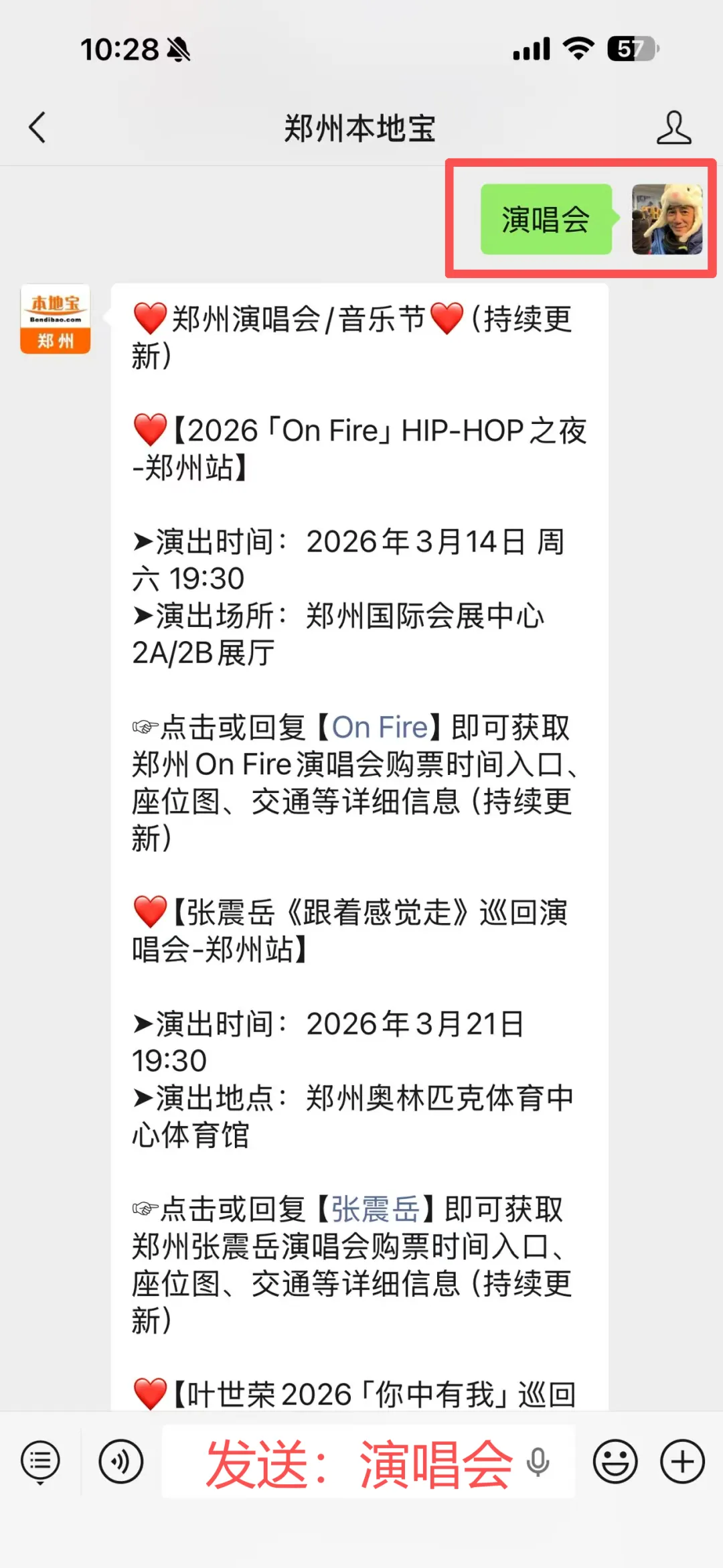 在对话框回复【演唱会】或明星歌手的名字