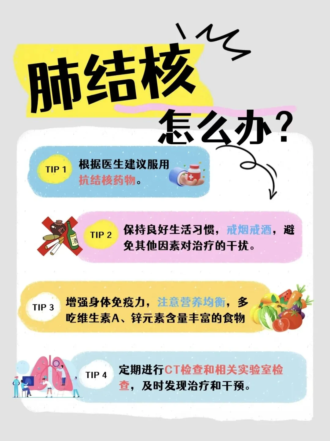 五、严禁吸烟,因烟雾进入肺内能直接引起肺损伤,降低肺脏防御功能,并导致呼吸道感染。影响肺结核的治愈,使病程迁延。