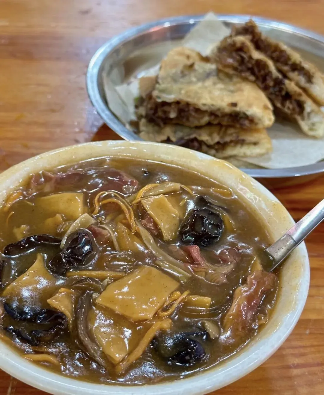 刚到那天,从早到晚没正经吃饭,饿到头晕眼花,也没心思找网红店,就在火车站附近随便钻进一家街边小馆。在广州待惯了,早就习惯了小份制、精致化的吃饭方式,一碗粉面分量刚好,不多不少。店里的阿姨端着一碗烩面重重放在我桌上时,我当场就看呆了,还以为是阿姨上错了菜。