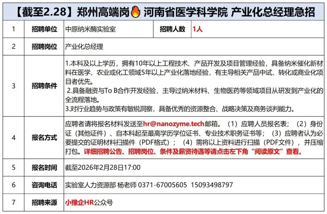 >【截至2.28】郑州高端岗 河南省医学科学院 产业化总经理急招