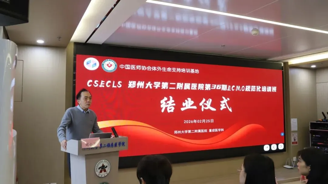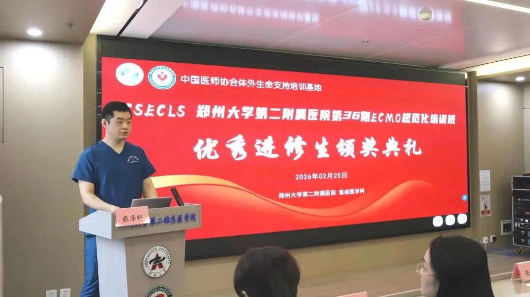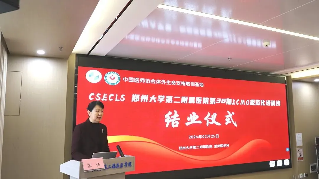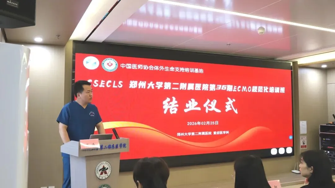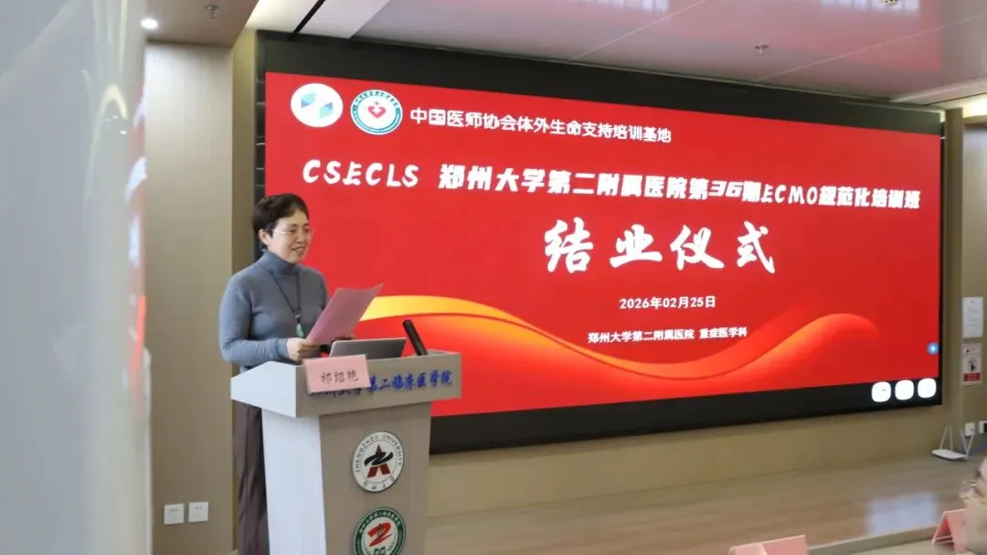 2026年2月25日郑州大学第二附属医院第三十六期国家级ECMO培训班结业仪式在教学科研楼学术报告厅隆重举行。本次仪式由郑州大学第二附属医院重症医学科祁绍艳主任主持。