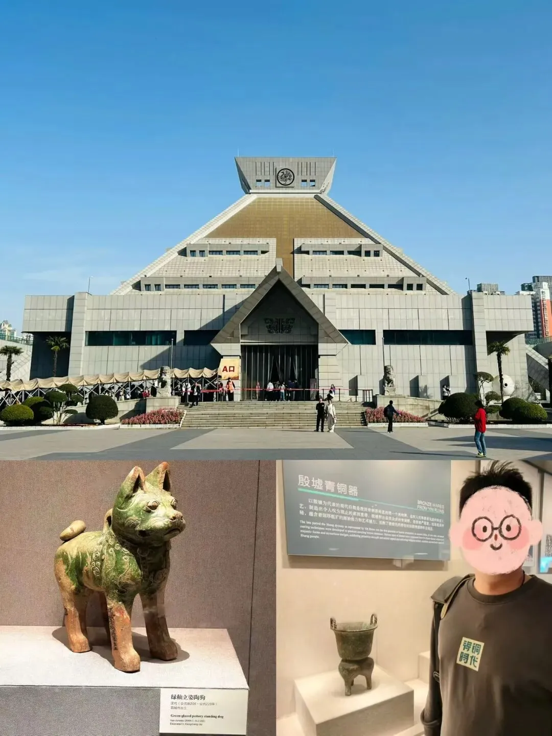 第二天踏入河南博物院,瞬间便被中原大地的厚重历史包裹。馆内的文字、文物,静静诉说着中华文明的一脉相承,从甲骨文字到周易哲学,从炎黄姓氏到夏代王朝,二十余个王朝在此建都的底蕴,都凝在一件件国宝之中。这里有从新石器时代到北宋晚期的九大镇院之宝:贾湖骨笛、杜岭方鼎、妇好鸮尊、玉柄铁剑、莲鹤方壶、云纹铜禁、四神云气图壁画、武则天金简、汝窑天蓝釉刻花鹅颈瓶……而那只汉代绿釉立姿陶狗,呆萌灵动的模样,让现代人看见千年前古人对宠物的温柔。临走前在文创店挑了许久,唐三彩盲盒、陶狗冰箱贴、仕女乐队保温杯,恨不得把整个博物院的记忆都带回家。