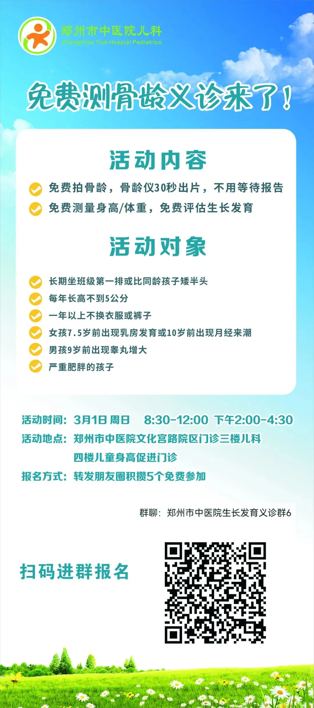 而春节后开学前,正是做一次全面生长发育评估的最佳时机:为了帮助家长更好的了解孩子的生长发育状态,郑州市中医院儿科生长发育团队联合针灸科针灸促高团队针对儿童生长发育问题,于3月1日开展生长发育义诊活动!