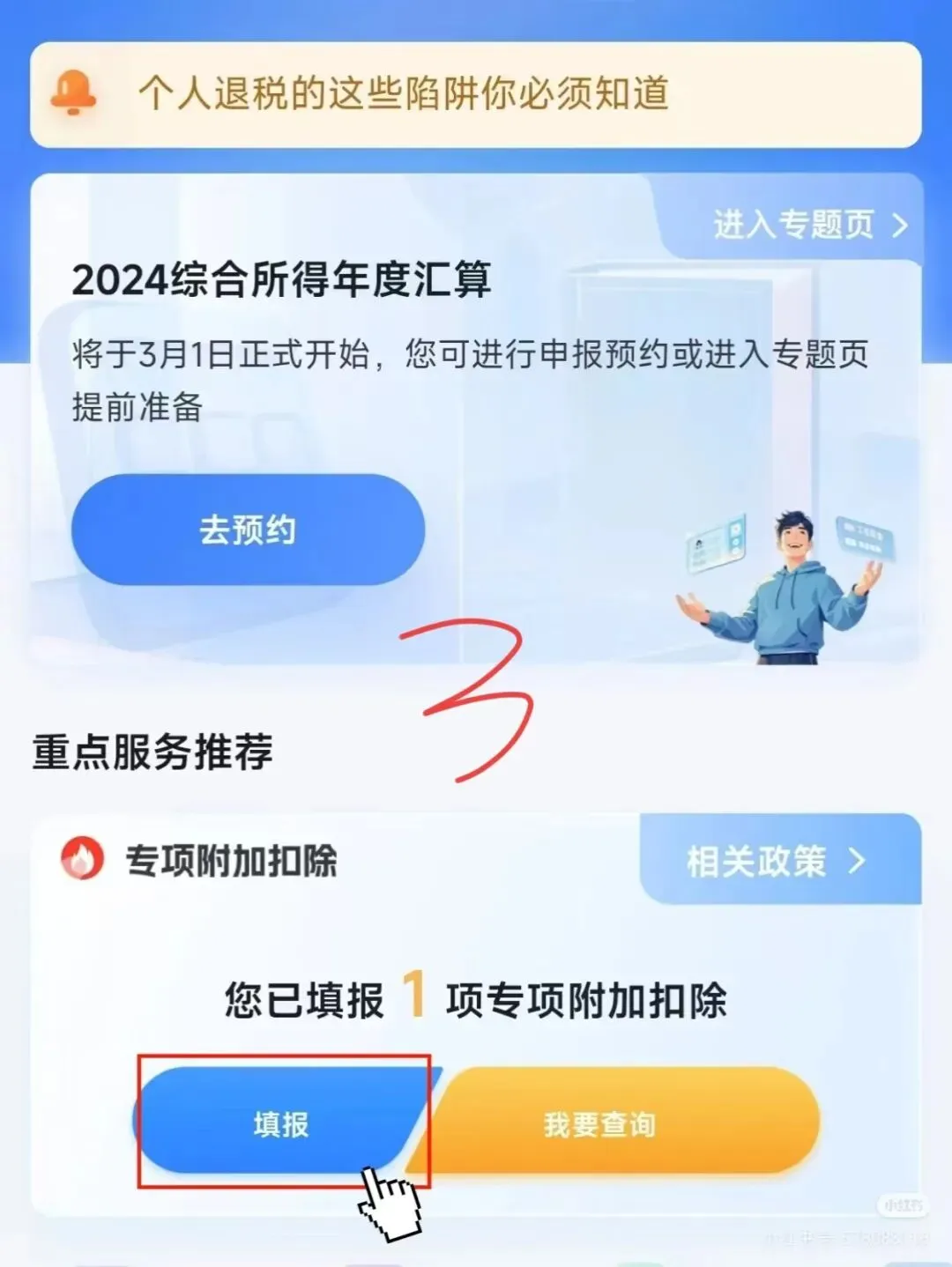 昨天一位郑州的朋友发来截图:退税到账,6328元。她说:“去年没当回事,随便填了填,今年认真研究了一下,多退了两千多。”3月1日起,2025年度的个人所得税退税正式开始。这是一年一度、国家给你的“回头钱”,只要你有交过个税,都值得花10分钟去操作一下。今天这篇保姆级攻略,帮你把流程、技巧、坑点全讲透。文末还有详细操作步骤,以及退税到账后怎么用更划算,记得看到最后。建议:想早点拿到钱的,现在就去APP预约。3月21日之后虽然不用约,但那时候申请的人多,审核慢,到账可能要等半个月。- 登录后进入“个人中心”-“银行卡”,绑定本人一类储蓄卡(退税收款用)
