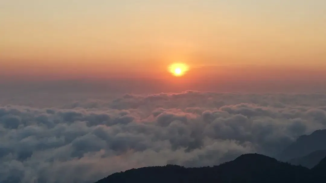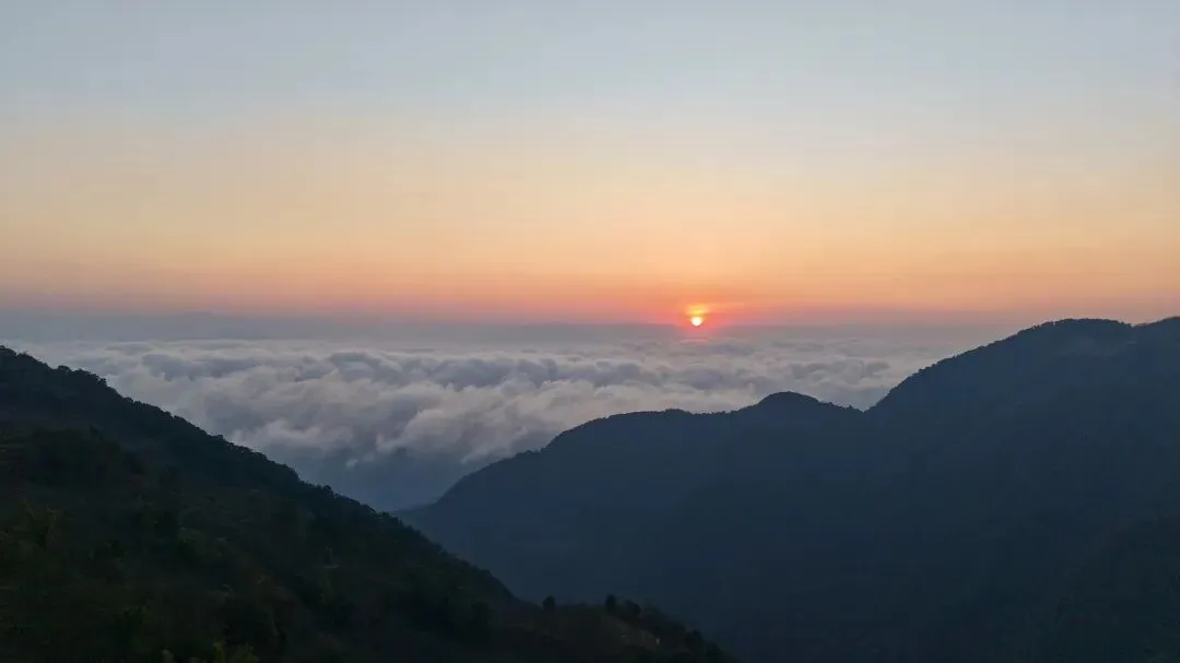 第四天一大早起来看日出云海,当天日出时间是 7:46 分,我大概 7 点带着珠姐从酒店出发,开了 20 公里,绕过半座山去东面看日出,幸亏带了无人机,赶上了翻滚的云海和红日,壮观到失语。