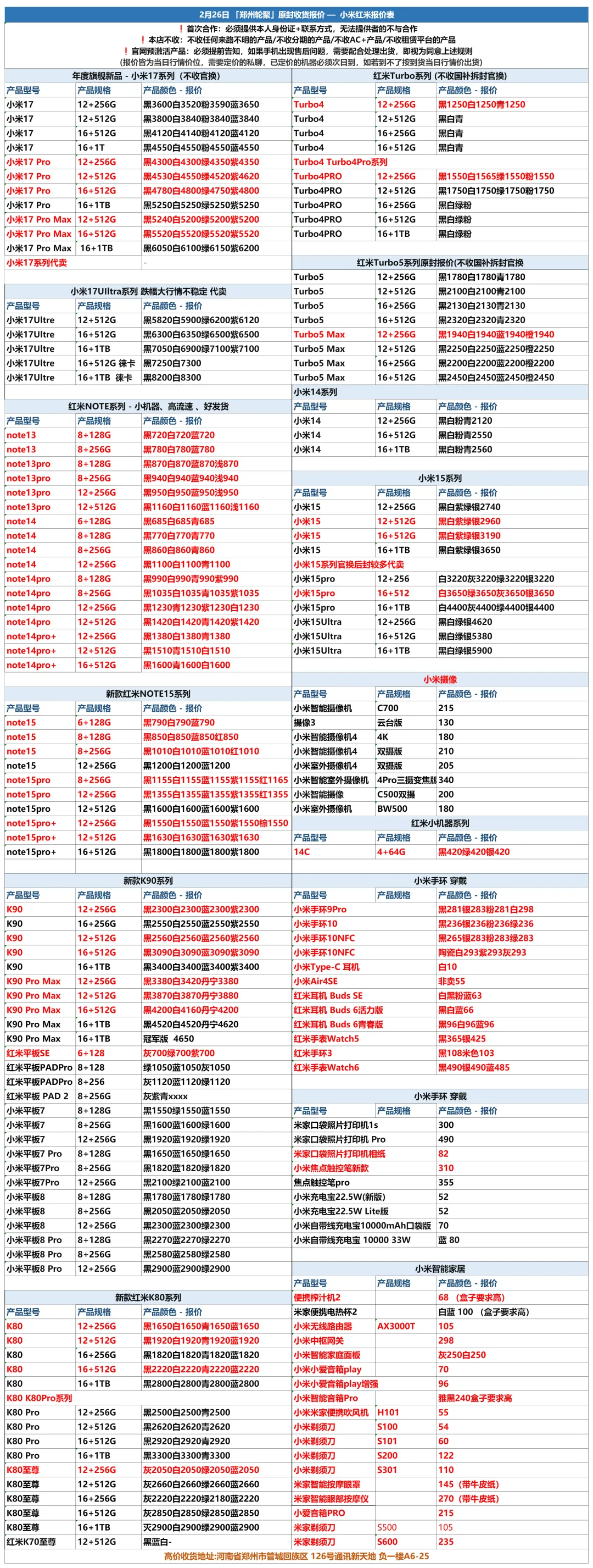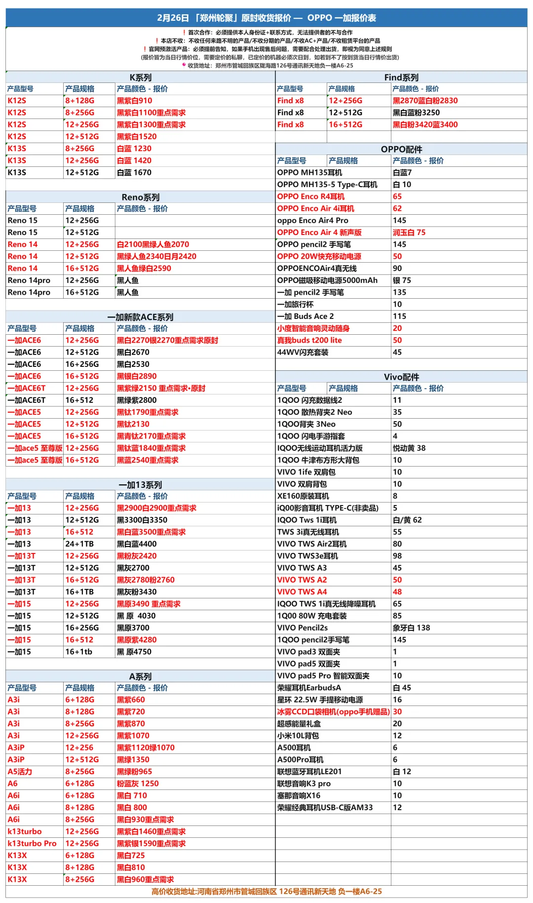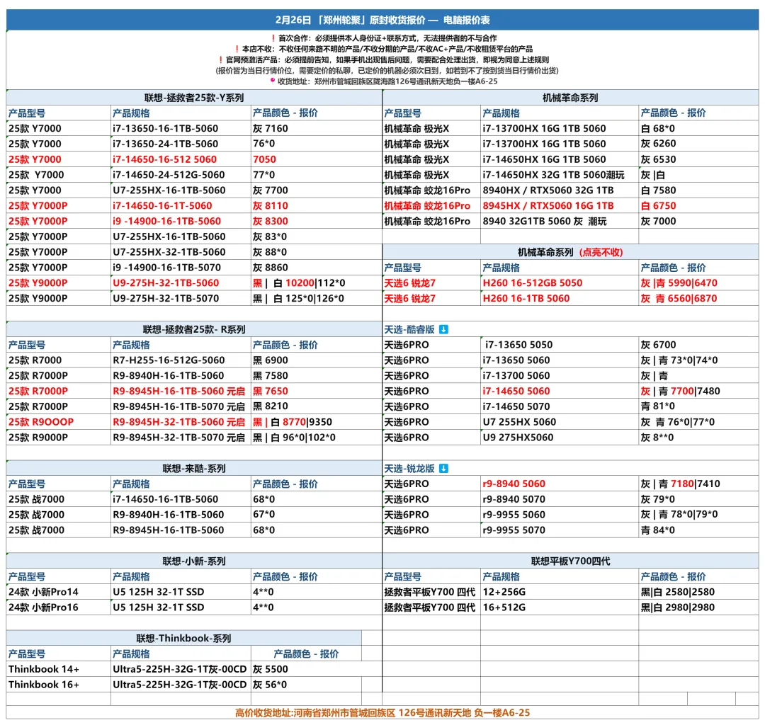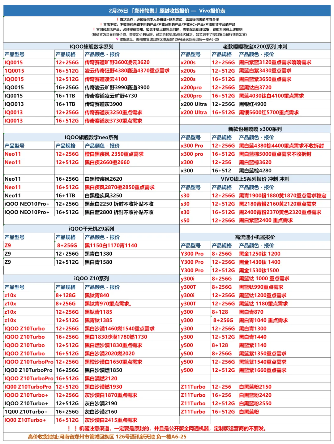 郑州轮聚通讯 2026年2.26日数码报价更新