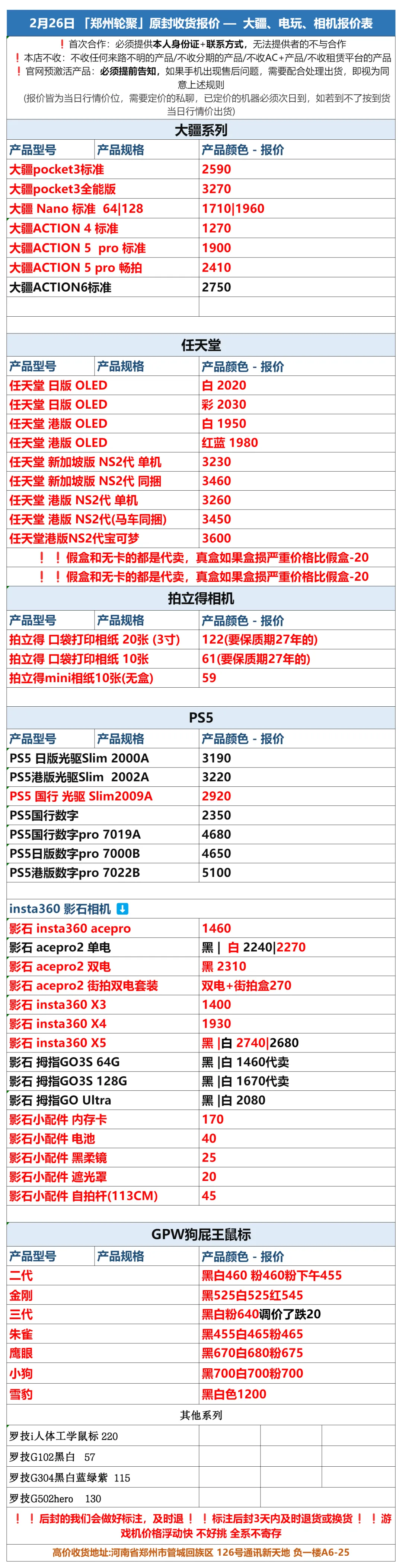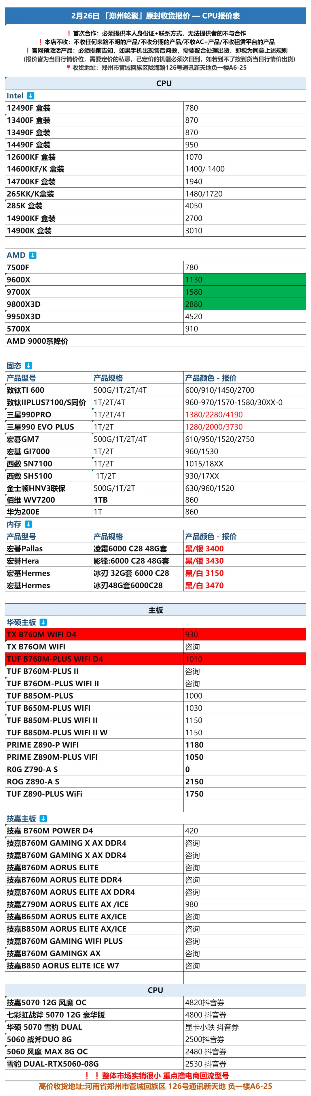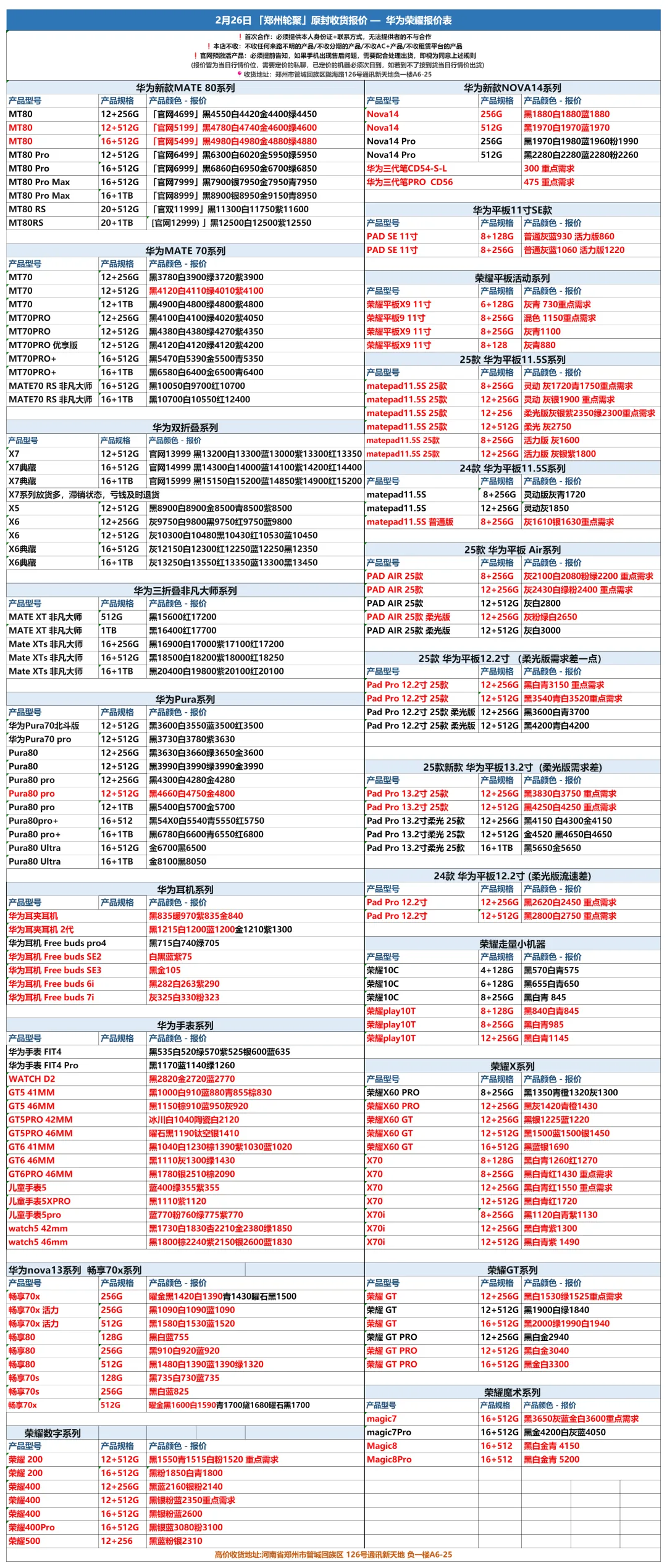 郑州轮聚通讯 2026年2.26日数码报价更新