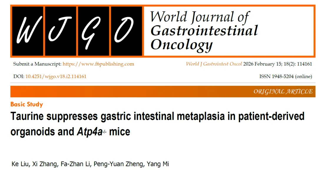 2026年2月,郑州大学第五附属医院团队在期刊《World Journal of Gastrointestinal Oncology》(IF:2.5)在线发表题为:Taurine suppresses gastric intestinal metaplasia in patient-derived organoids and Atp4a -/- mice的高水平研究论文。