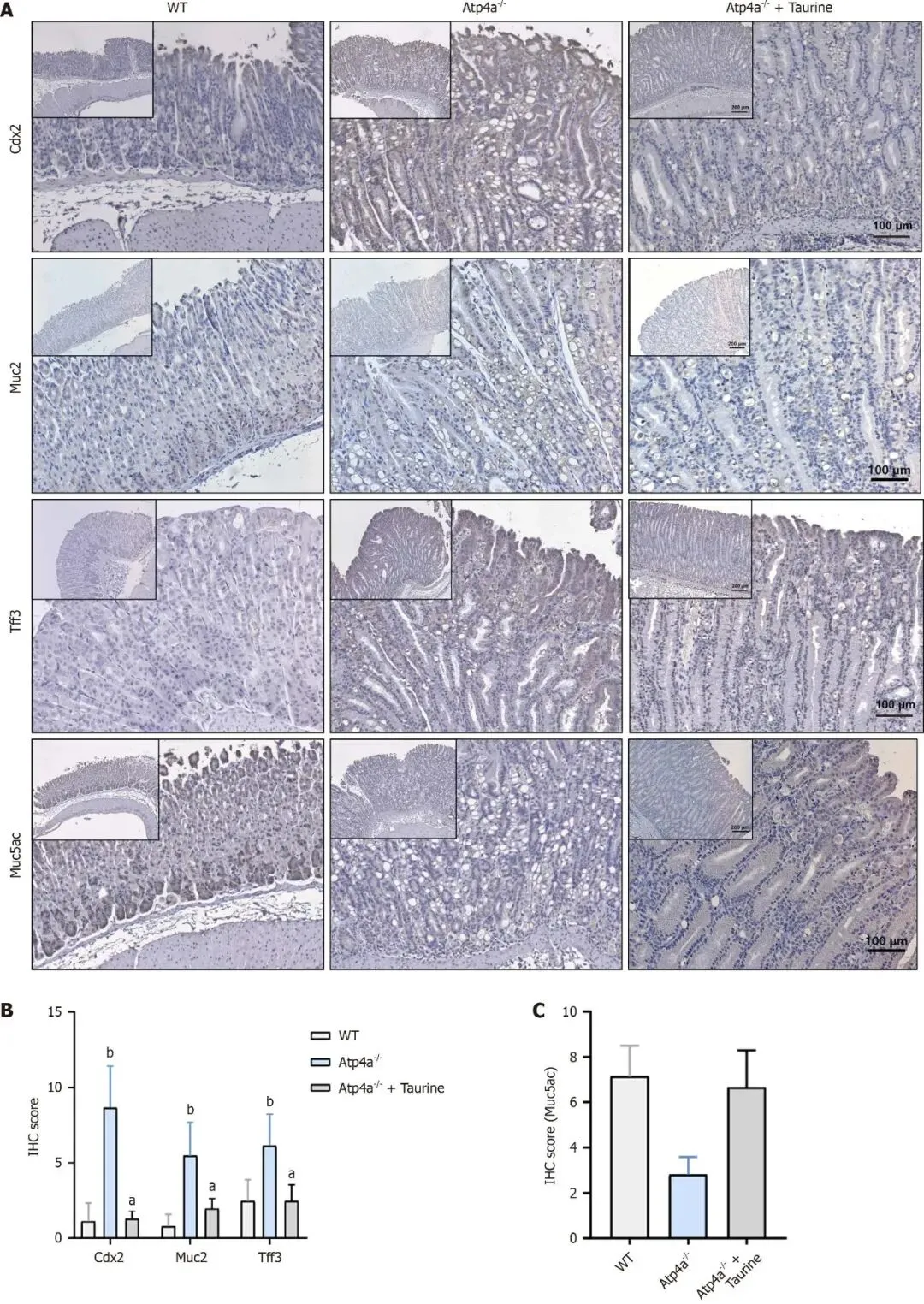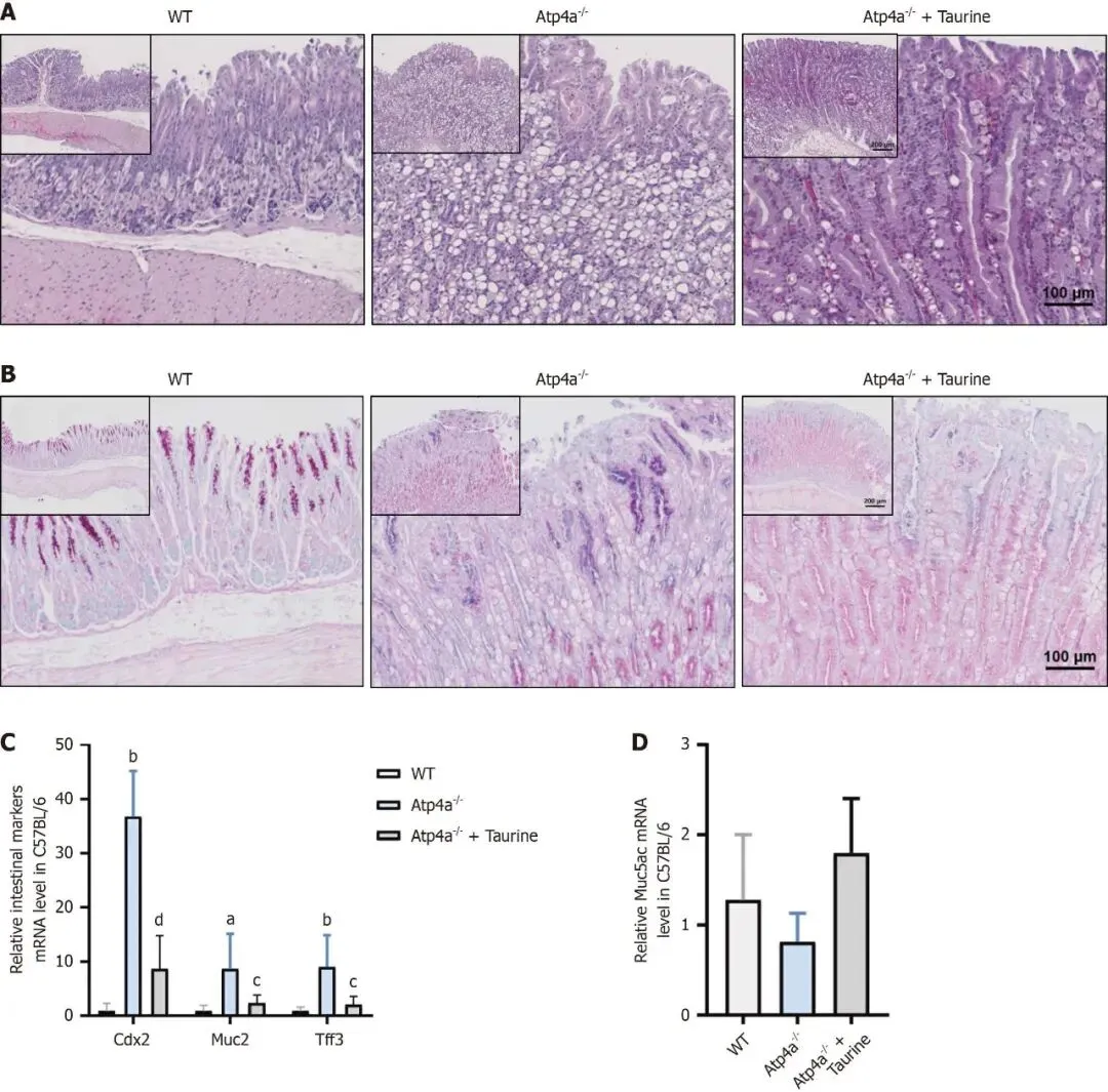 结果:我们确认,牛磺酸治疗显著缓解了Atp4a-/-小鼠的病理变化,包括腺体肥大和空泡扩张,并减轻了GIM的严重程度,相比未处理模型组,差异显著。在牛磺酸治疗下,MUC5AC表达显著增加,而肠特异性标志物CDX2、MUC2和TFF3表达下降(P < 0.05)。同时,在患者来源的GIM类器官中,牛磺酸治疗显著改善了GIM特征,表现为MUC5AC表达增加,以及CDX2、MUC2和TFF3表达下降。
