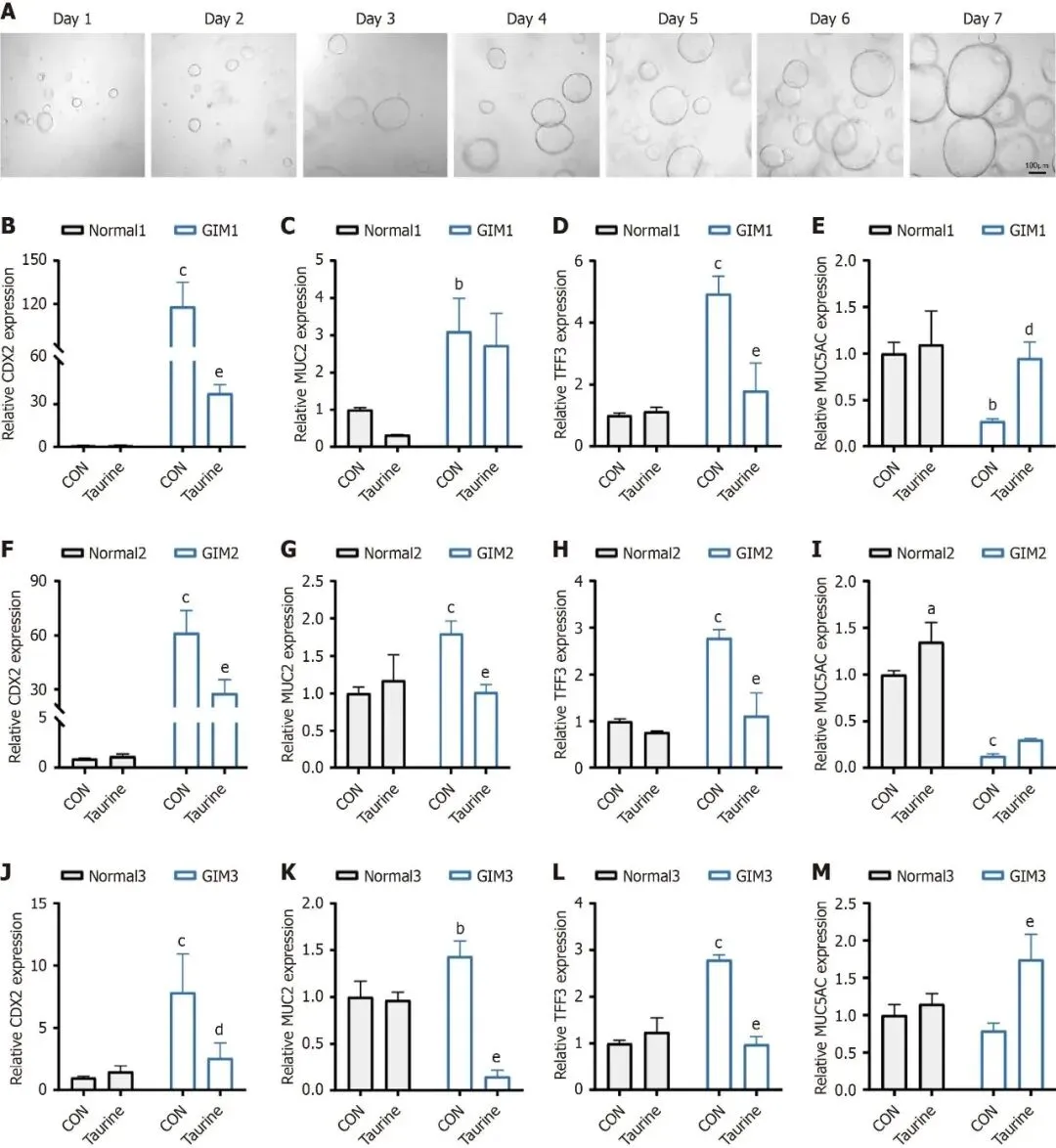 Figure 3展示了人源GIM类器官模型的建立及牛磺酸干预效应。A图显示正常胃类器官7天培养的典型生长过程。B-M图为3例独立患者样本的qPCR结果,显示与配对正常类器官相比,GIM类器官中CDX2、MUC2、TFF3显著高表达而MUC5AC显著低表达,证实模型成功再现GIM分子特征。经牛磺酸干预后,GIM类器官中三种肠道标志物表达显著降低,患者1和3的MUC5AC显著上调,患者2呈上调趋势,而正常类器官标志物表达无显著变化,提示牛磺酸对GIM具有选择性调控作用。