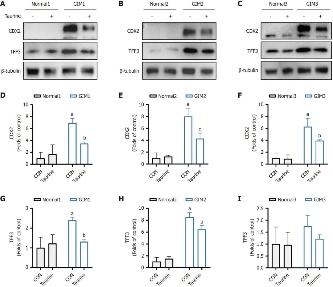 Figure 4通过Western blot在蛋白水平验证类器官干预结果。A-C图显示3例患者GIM类器官中CDX2和TFF3蛋白条带,D-I图为定量统计结果。与正常对照相比,GIM类器官CDX2和TFF3蛋白水平显著升高;牛磺酸干预后两种蛋白表达均显著下调,与mRNA结果一致,进一步证实牛磺酸在人源体系中可抑制GIM相关标志物表达,支持其临床转化潜力。