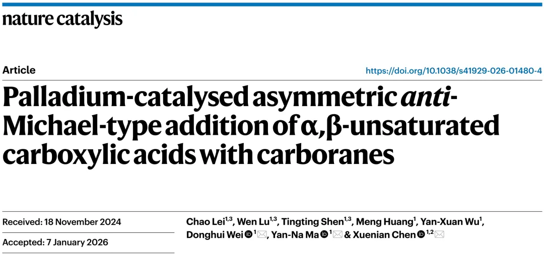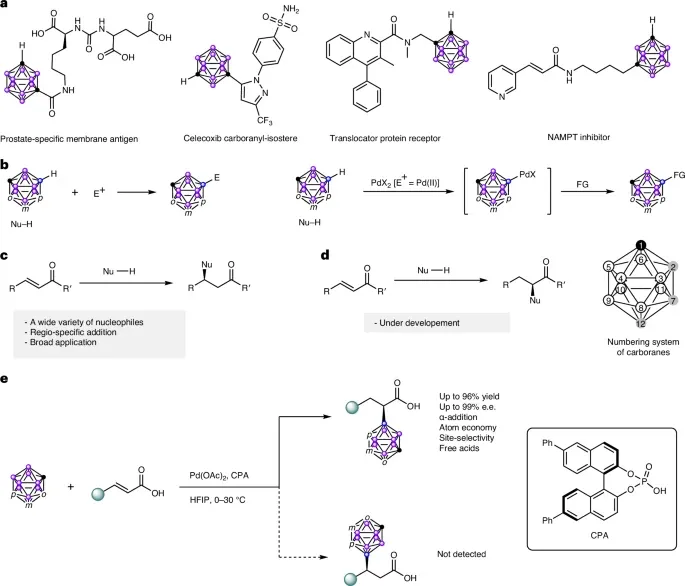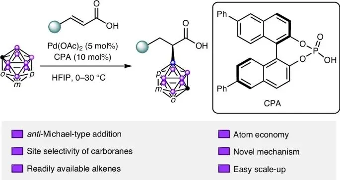 今天,分享一个钯催化反迈克尔型不对称加成研究成果,该文章发表在《Nature Catalysis》期刊该研究报道了一种新颖的钯催化不对称反应,实现了亲核试剂(碳硼烷)对α,β-不饱和羧酸的反向α-加成,突破了传统的迈克尔加成模式。该方法具有高选择性、高效性和广泛适用性,为合成手性α-取代羧酸提供了新策略,并通过机理研究揭示了其选择性来源。该研究领域的背景、面临的挑战以及本研究提出的创新性解决方案:研究背景与动机: