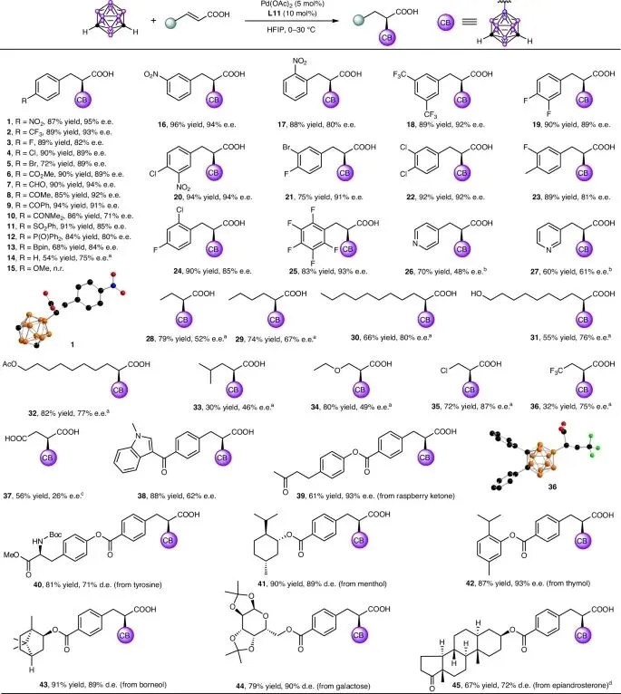 结果表明该催化体系对多种碳硼烷衍生物均表现出良好的适用性和优异的对映选择性控制: