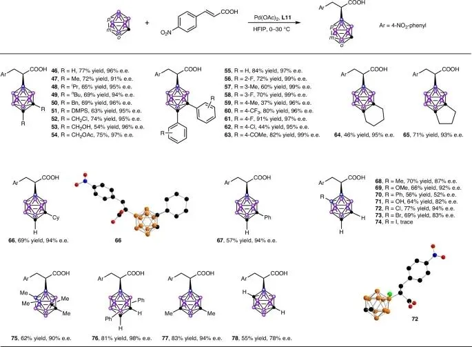 间/对碳硼烷:1,7-二甲基间碳硼烷顺利反应,得到产物77(83%产率,94% ee)。惰性更高的对碳硼烷在该体系中也能够反应,以55%产率和78% ee得到目标产物78。