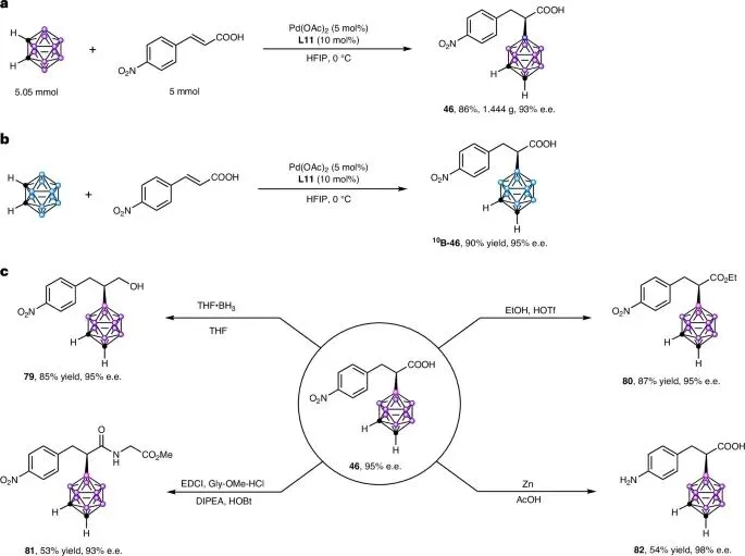 规模化与同位素标记:邻碳硼烷与4-硝基肉桂酸的克级规模反应顺利获得产物46,产率86%,ee值93%,展示了反应的稳健性。该方法同样适用于1010B富集的邻碳硼烷,高效合成硼中子俘获治疗所需的1010B标记手性分子1010B-46(90%产率,95% ee)。