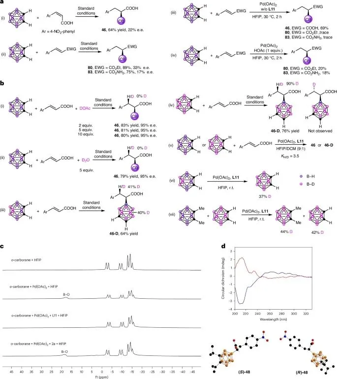 顺式加成与钯迁移:氘代碳硼烷实验表明,B-D通过顺式加成转移到烯酸β位;反应中观测到碳硼烷硼顶点间的H/D均一化分布,表明存在可逆的钯迁移过程。
