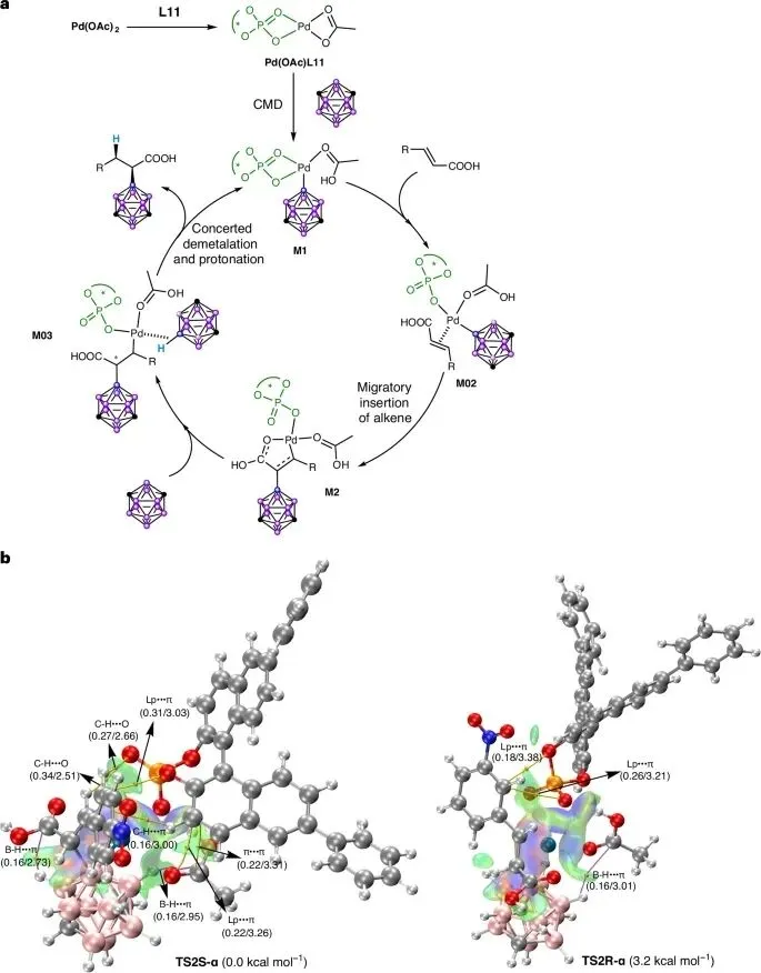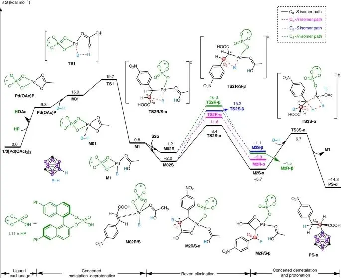 动力学研究验证:反应动力学测定显示对碳硼烷、手性磷酸和钯催化剂为一级,对不饱和羧酸为逆级数。这证实了碳硼烷、催化剂和手性磷酸参与决速步,而不饱和羧酸的逆级数归因于其阴离子配位后形成的催化剂Pd(S₂)L11活性低于原乙酸根配位的Pd(OAc)L11。