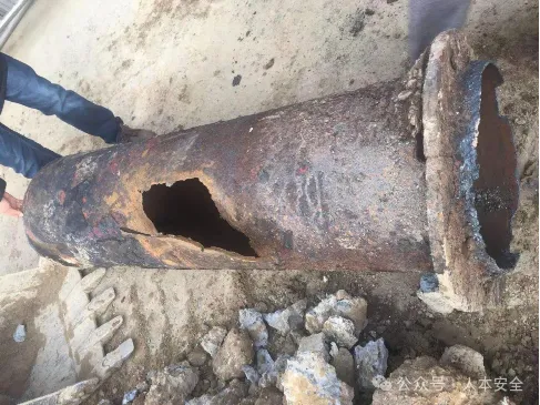 发生爆裂的管道为郑州热力集团有限公司大学路DN450供热主管,该管道爆管处由于距地下雨污水管道较近,附近为积水点,管道受雨污水的浸泡;土壤中有水分和盐类的存在,使土壤具有电介质溶液特征,管道保护层局部被破坏,金属外壁的局部腐蚀加剧,使管道金属厚度减薄。