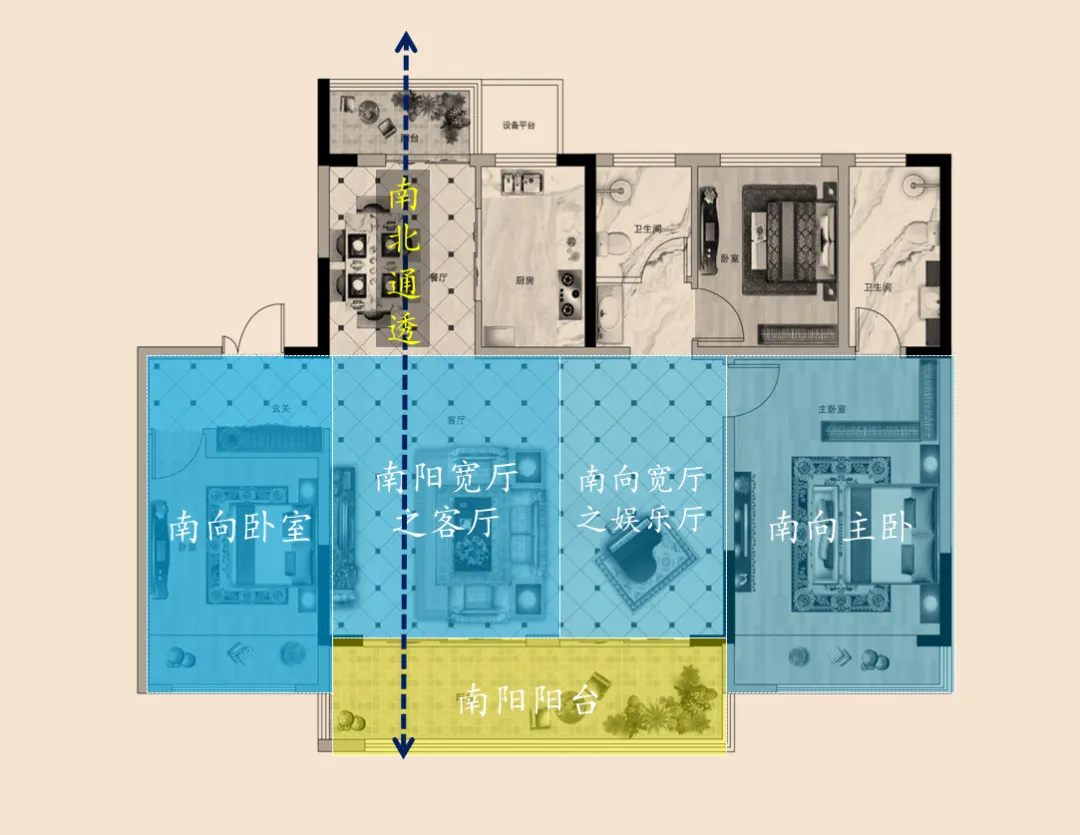 3、南阳双开间阳台设计。大部分90㎡+的纯南三房产品都是南向单开间阳台设计。