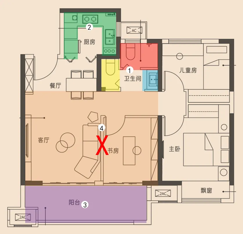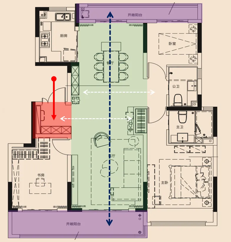 ⑤、公共卫生间闪开主卧门口,形成私密和静谧。