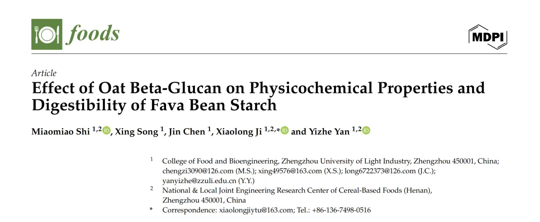 郑州轻工业大学食品与生物工程学院:Miaomiao Shi(第一作者)、冀晓龙副教授(通讯作者)等在期刊《foods》(IF:5.5)上发表了题为“Effect of Oat Beta-Glucan on Physicochemical Properties and Digestibility of Fava Bean Starch”的论文。