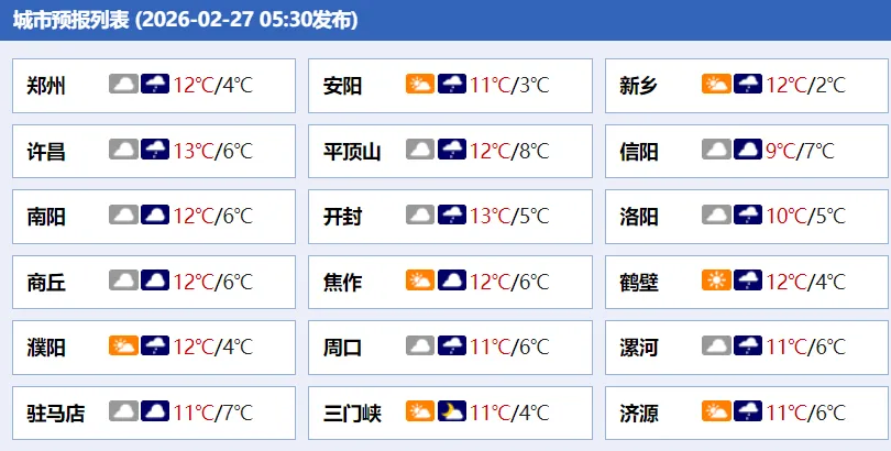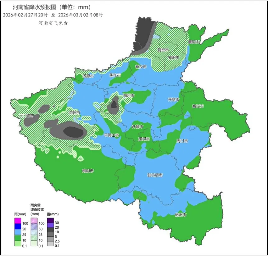 ⭐受冷空气和暖湿气流共同影响,河南省气象台预计27日夜里至3月1日,全省有小到中雨,其中西部、北部部分县(市、区)小到中雨转雨夹雪或小雪,高海拔山区雨夹雪转中到大雪,局部暴雪。详情>>