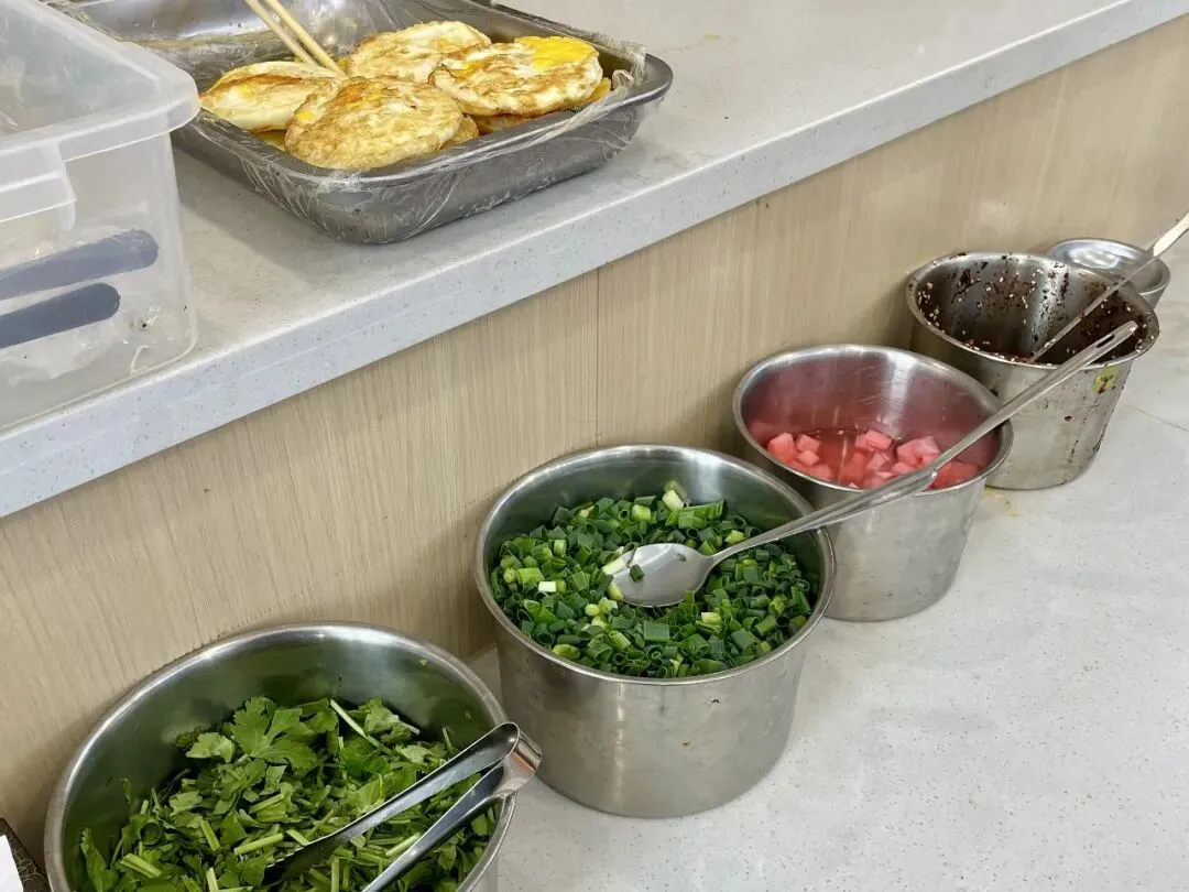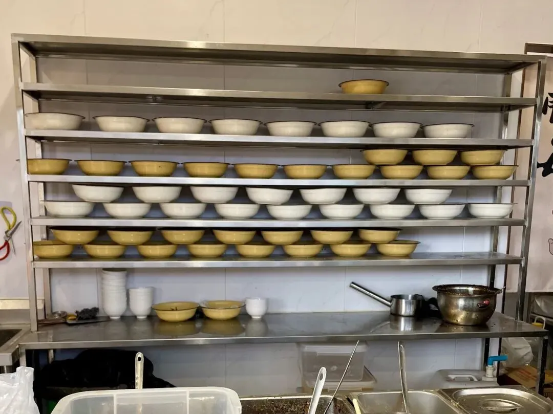 滚水烫面锅后边有一个置物架,摆了不少已经提前打好料的碗盆,看来饭点时刻的生意应该不错。