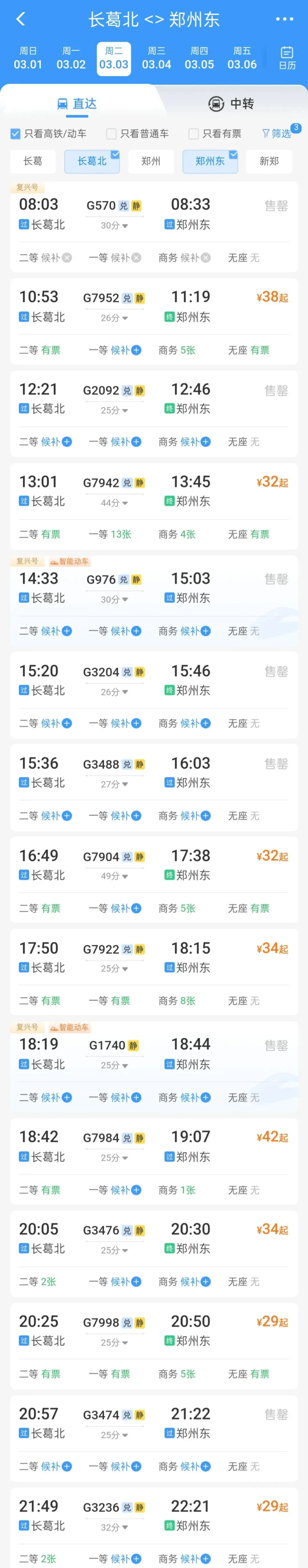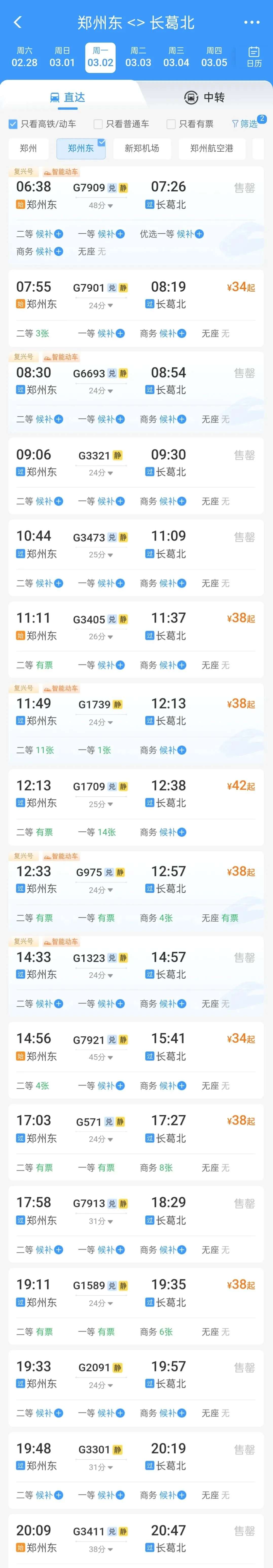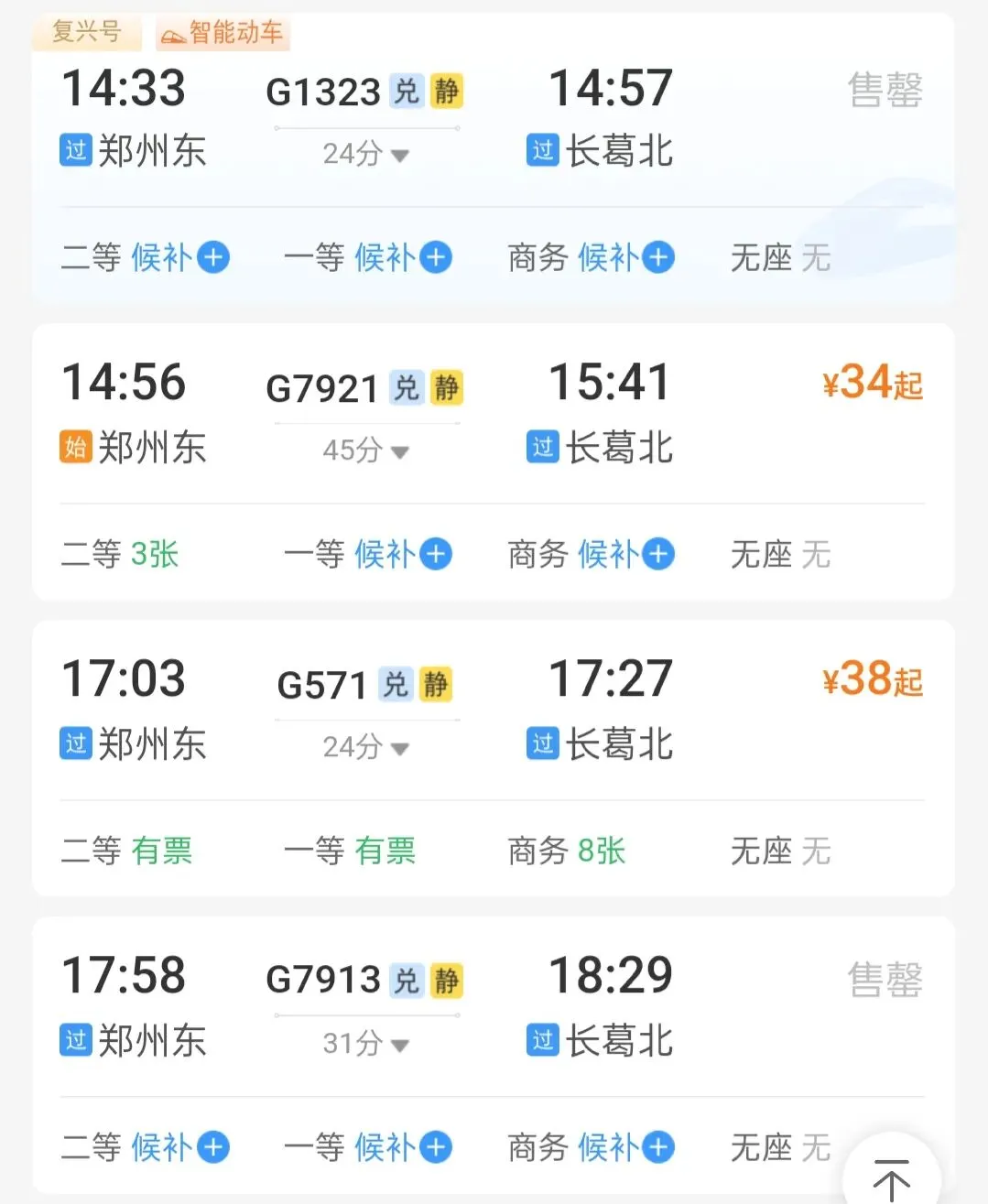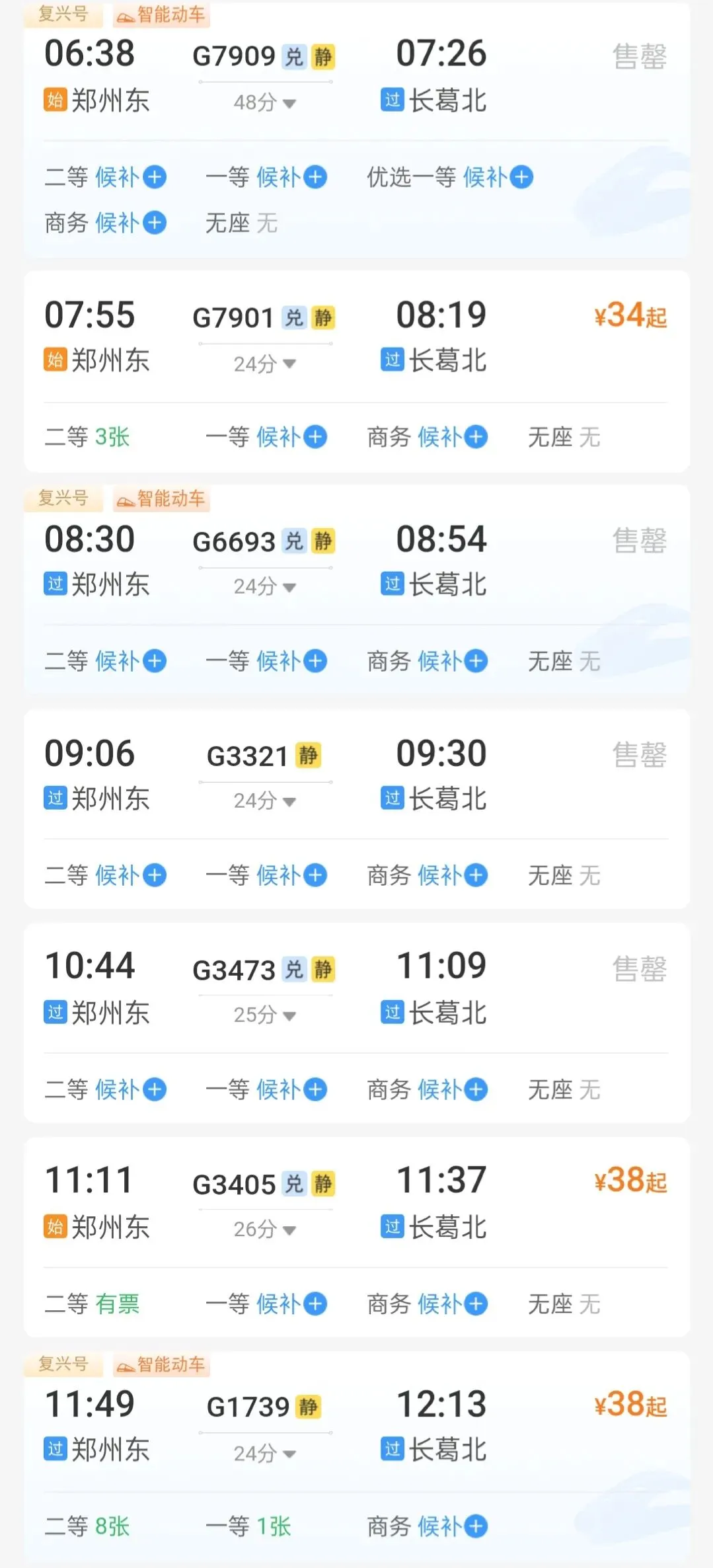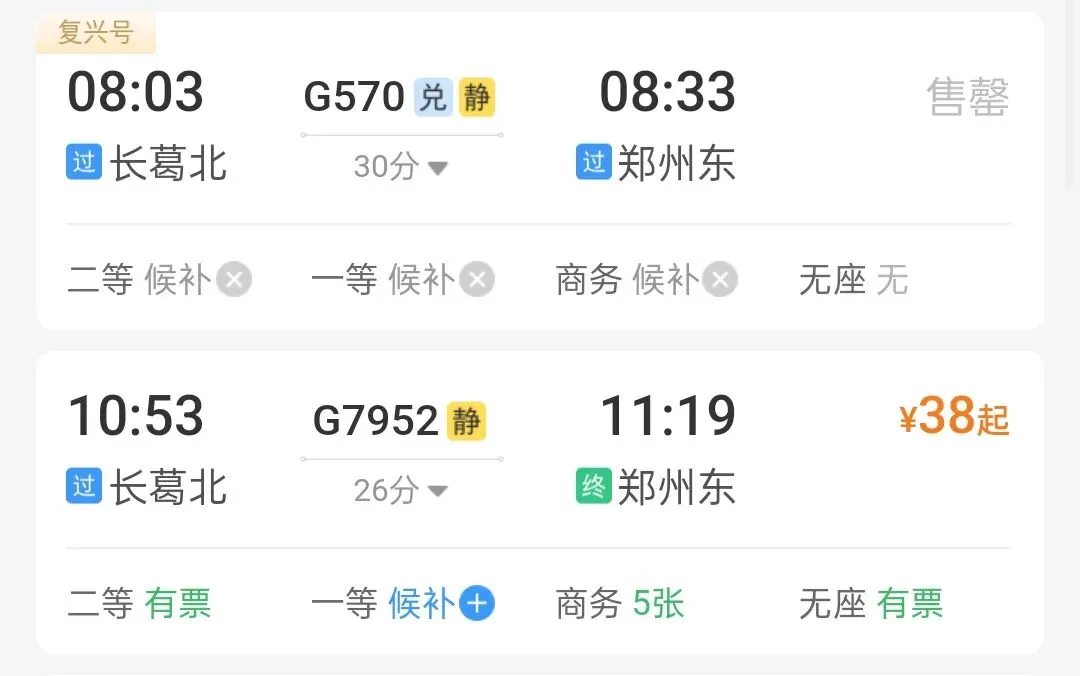 长葛北到郑州东,上午有2趟列车,发车时间分别为8点03分、10点53分。