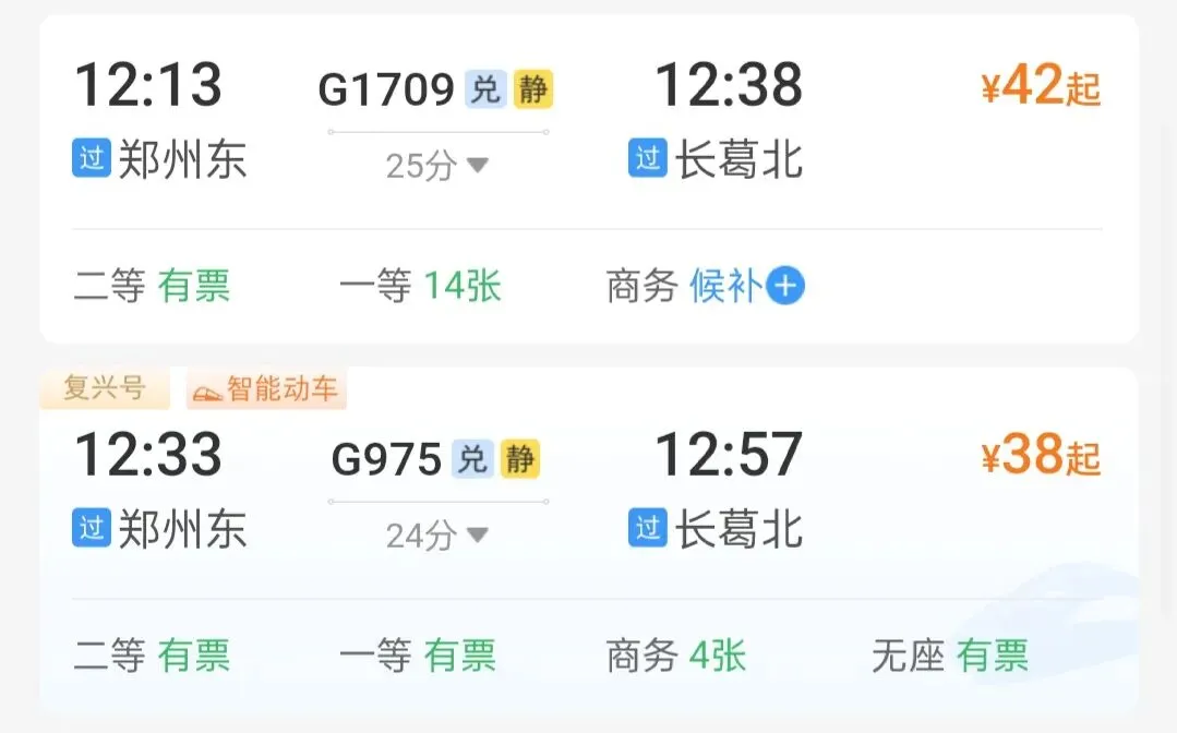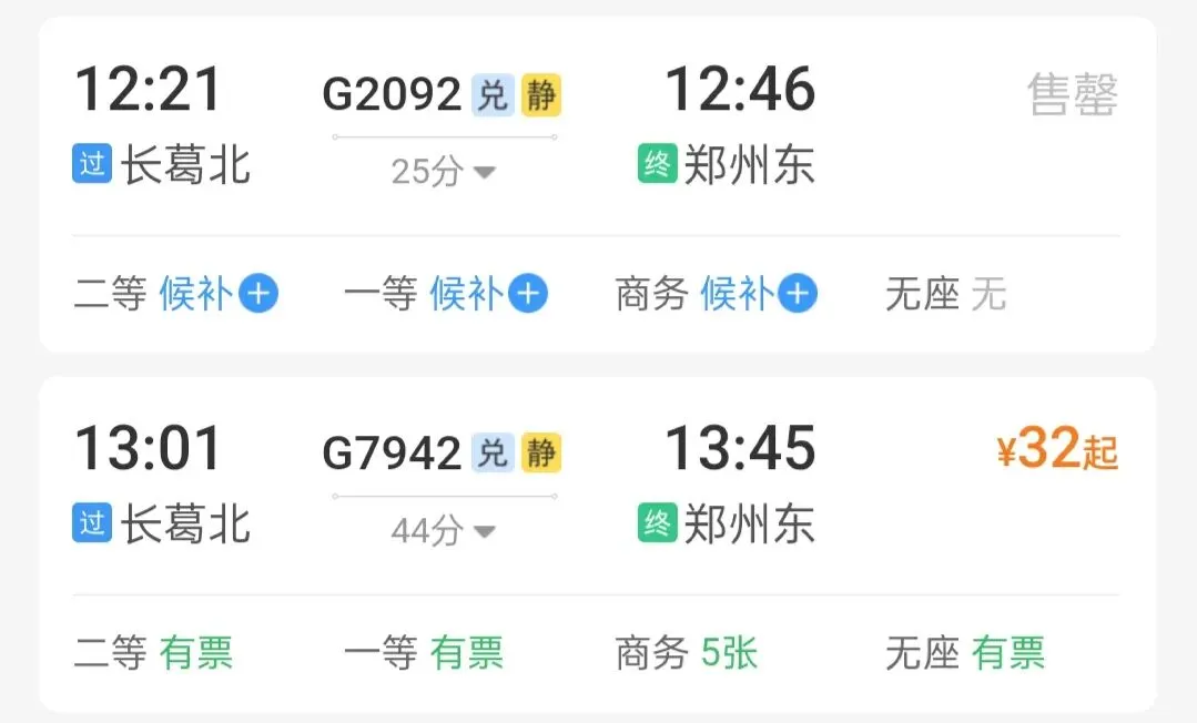 长葛北到郑州东,中午有2趟列车,发车时间分别为12点21分、13点01分。