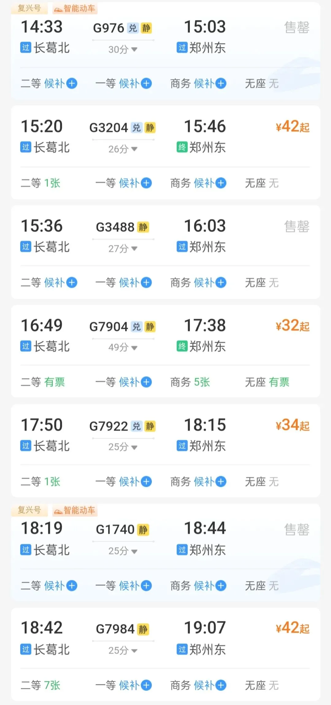 长葛北到郑州东,下午有7趟列车,发车时间分别为14点33分、15点20分、15点36分、16点49分、17点50分、18点19分、18点42分。