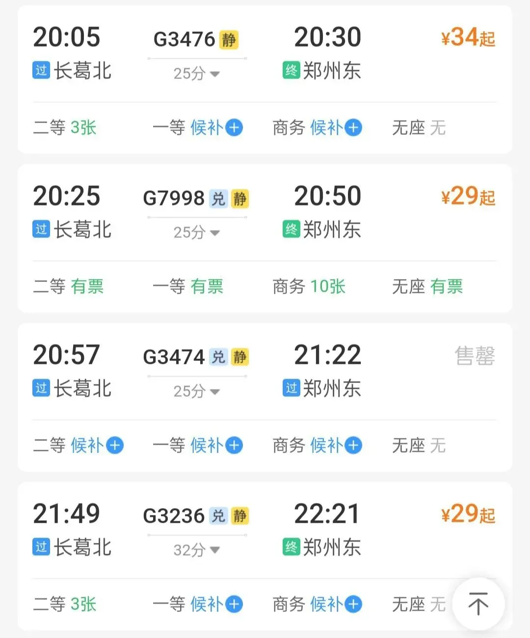 长葛北到郑州东,晚上有4趟列车,发车时间分别为20点05分、20点25分、20点57分、21点49分。
