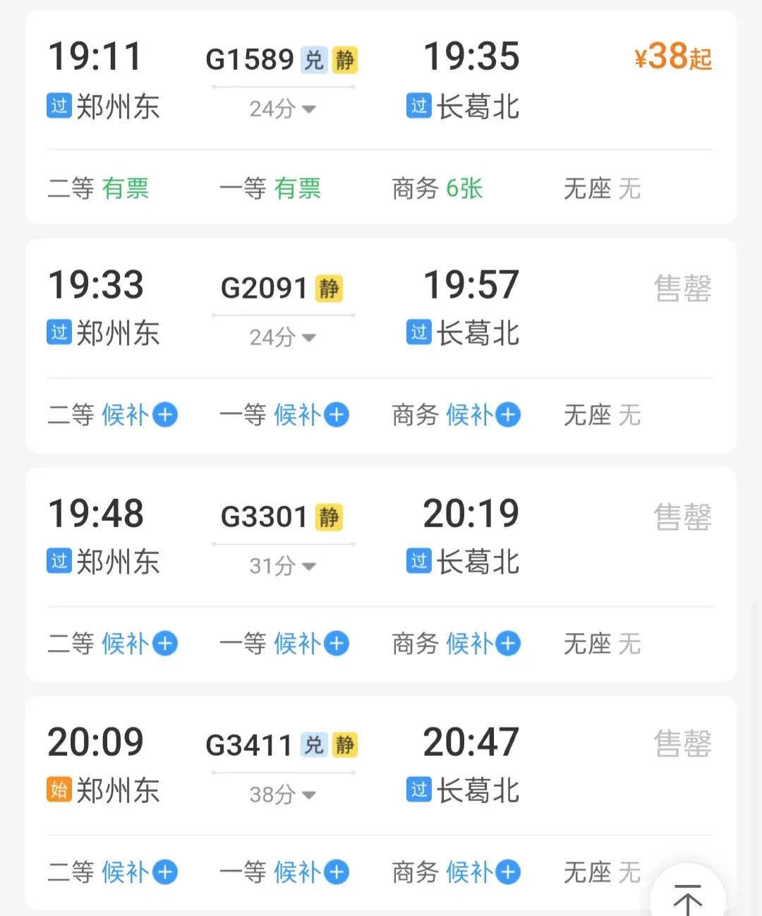 郑州东到长葛北,晚上有4趟列车,发车时间分别为19点11分、19点33分、19点48分、20点09分。