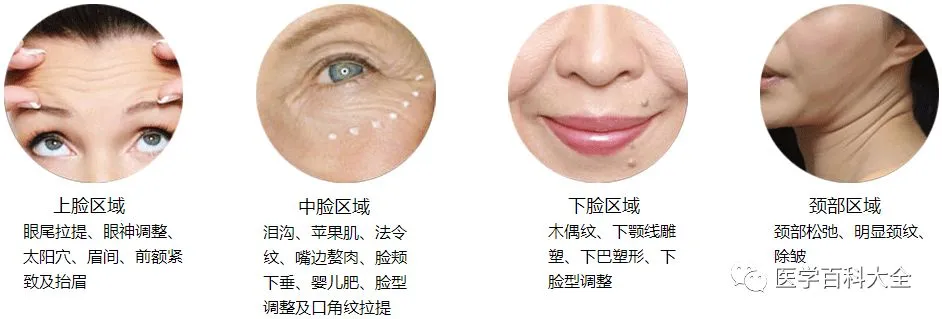 脸部凹凸洞复平、矫正面瘫歪脸、提升收紧脸部松弛的肌肉、改变面部轮廓、瘦脸、祛痘、祛黄、祛皱、粗毛孔变细、淡化深层斑、治疗脸部因暗疮诱发的顽固创面等。