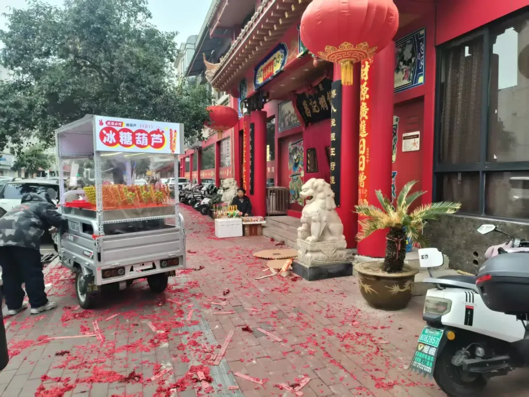 2月25日(大年初九),郑州经一路上的葛记焖饼门店为迎接“开门红”,在门前人行道上燃放鞭炮,而距该处向南320米处,就是丰产路派出所,最终该店被处罚。