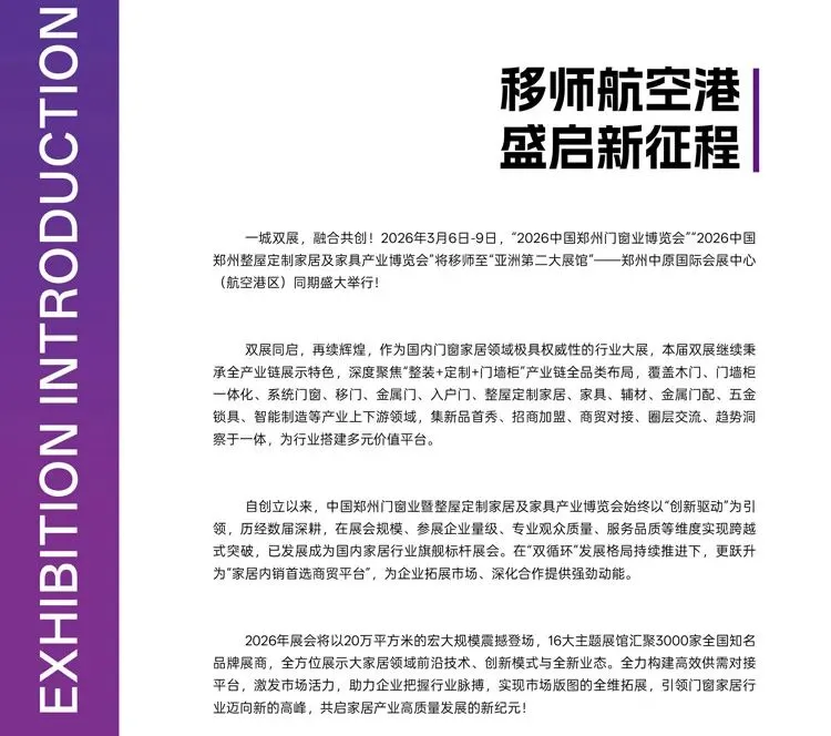 一城双展,融合共创!2026年3月6日-9日,“2026中国郑州门窗业博览会”“2026中国郑州整屋定制家居及家具产业博览会”将移师至“亚洲第二大展馆”——郑州中原国际会展中心(航空港区)同期盛大举行!